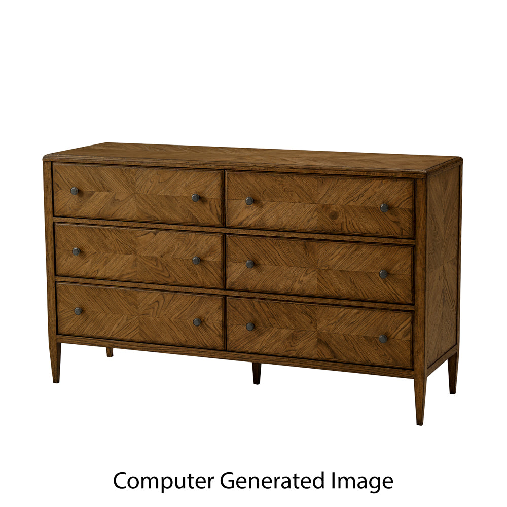 A luminary moment, NOVAs architecturally detailed oak parquetry dresser fitted with six hand-veneered drawers is an ideal piece for your bedroom. The Dusk finish pairs immaculately with the tapered oak legs and fine Verde Bronze handles.
