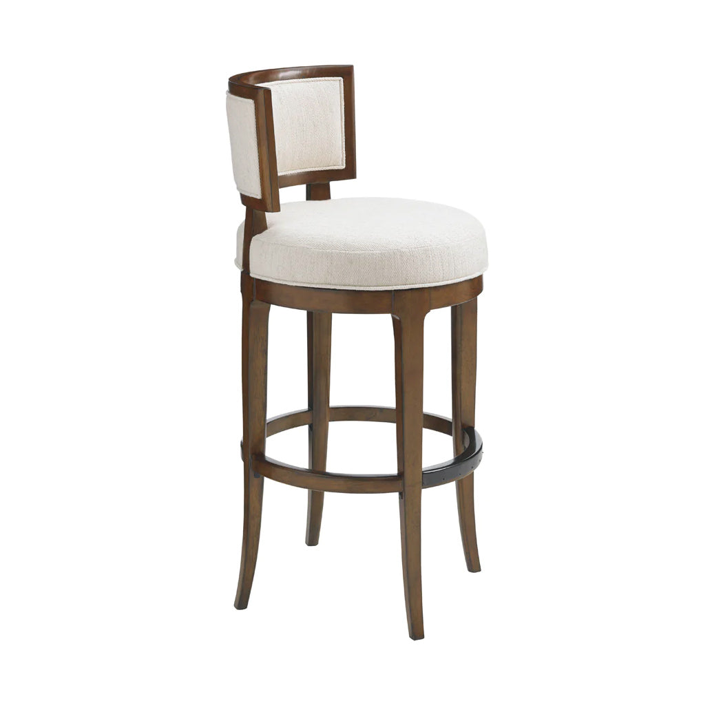 This subtly curved swivel stool features an upholstered seat and inside back in Ivory fabric - a durable off-white textural weave with a cobblestone pattern and soft hand. Tapered legs and a foot rest complete the stool. With a refined yet restrained aesthetic, Pan-Asian design ascribes great value to visual composition, clean disciplined lines and the goal of infusing tranquility into todays contemporary décor. Island Fusion embraces the Zen side of Tommy Bahama Home, with bold designs that blend horizontal and vertical elements, dramatic statement hardware and accents of eclectic natural materials that offer a unique look to every piece. The result is a striking modern expression of personal style, with a vibe that feels relaxed and livable. Statement pieces define the room, while custom upholstery offers an invitation to enjoy the laid-back comfort of casual sophisticated living. Stool ships assembled.