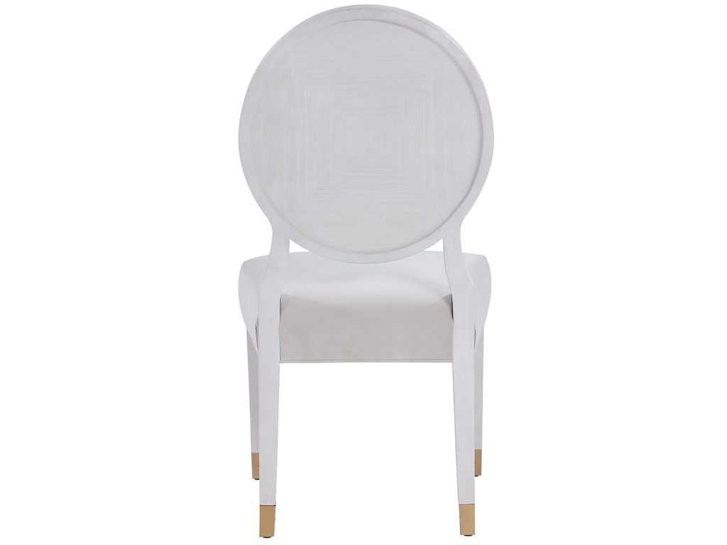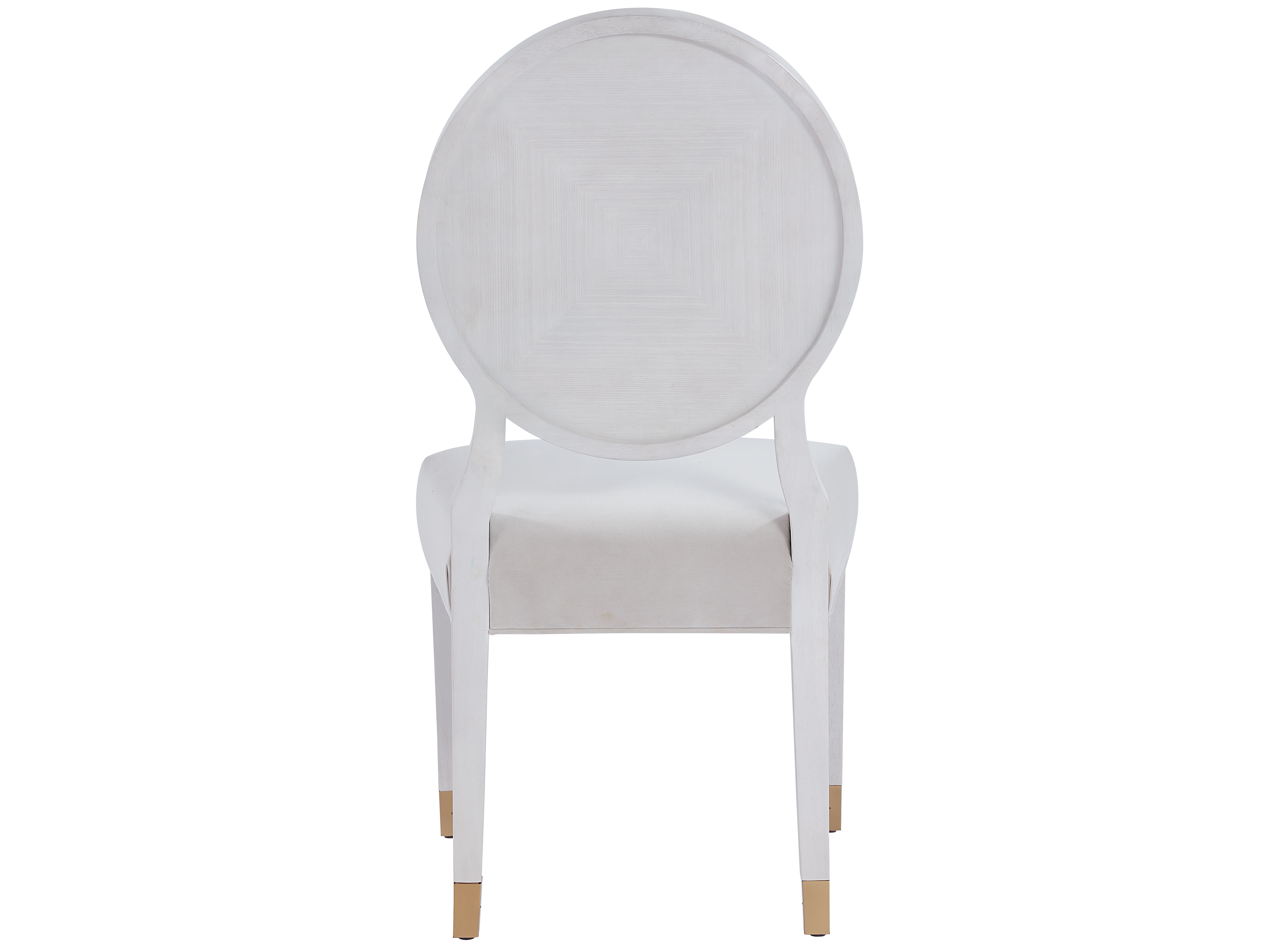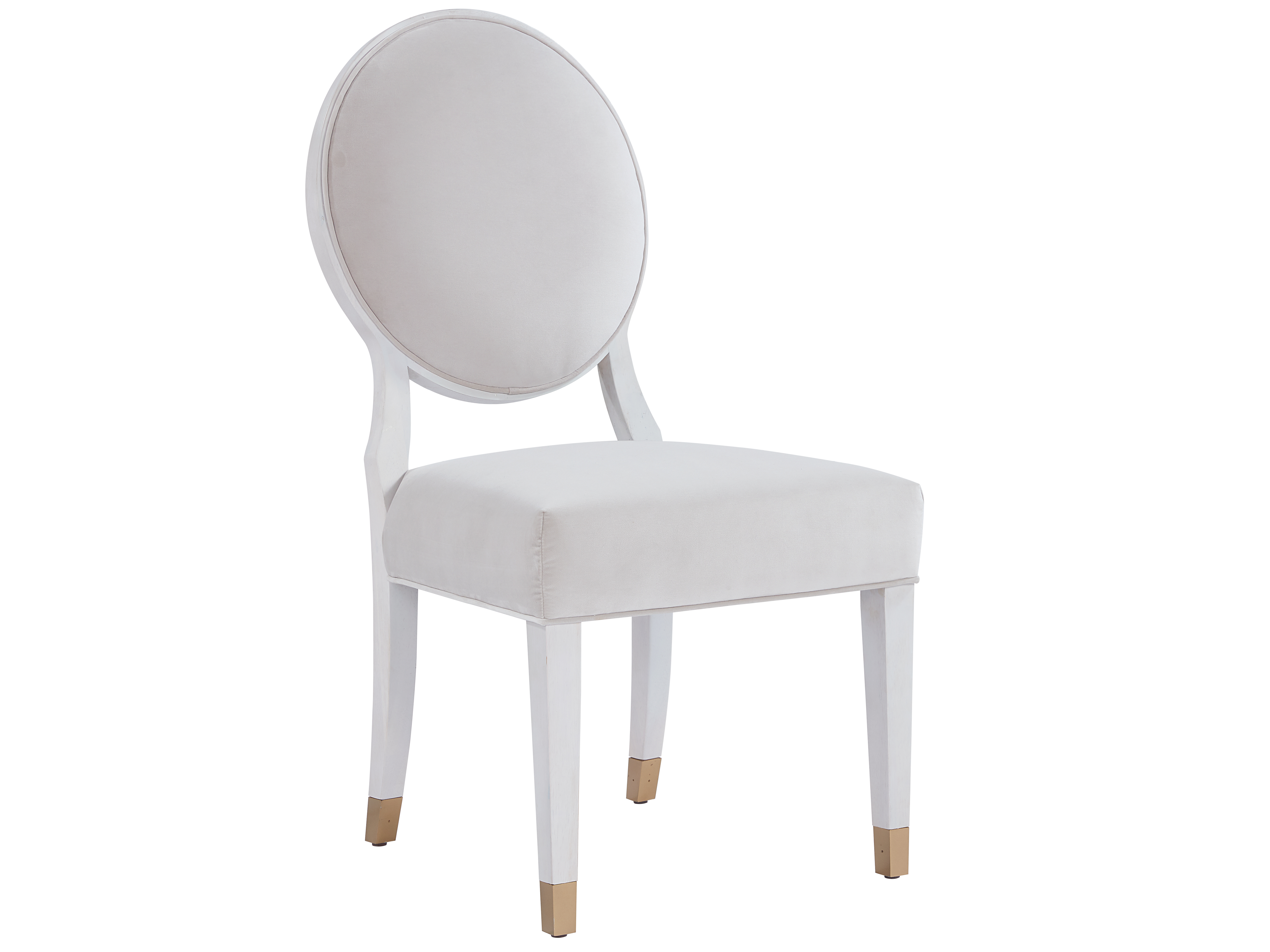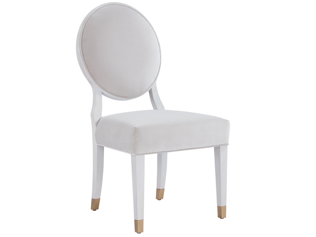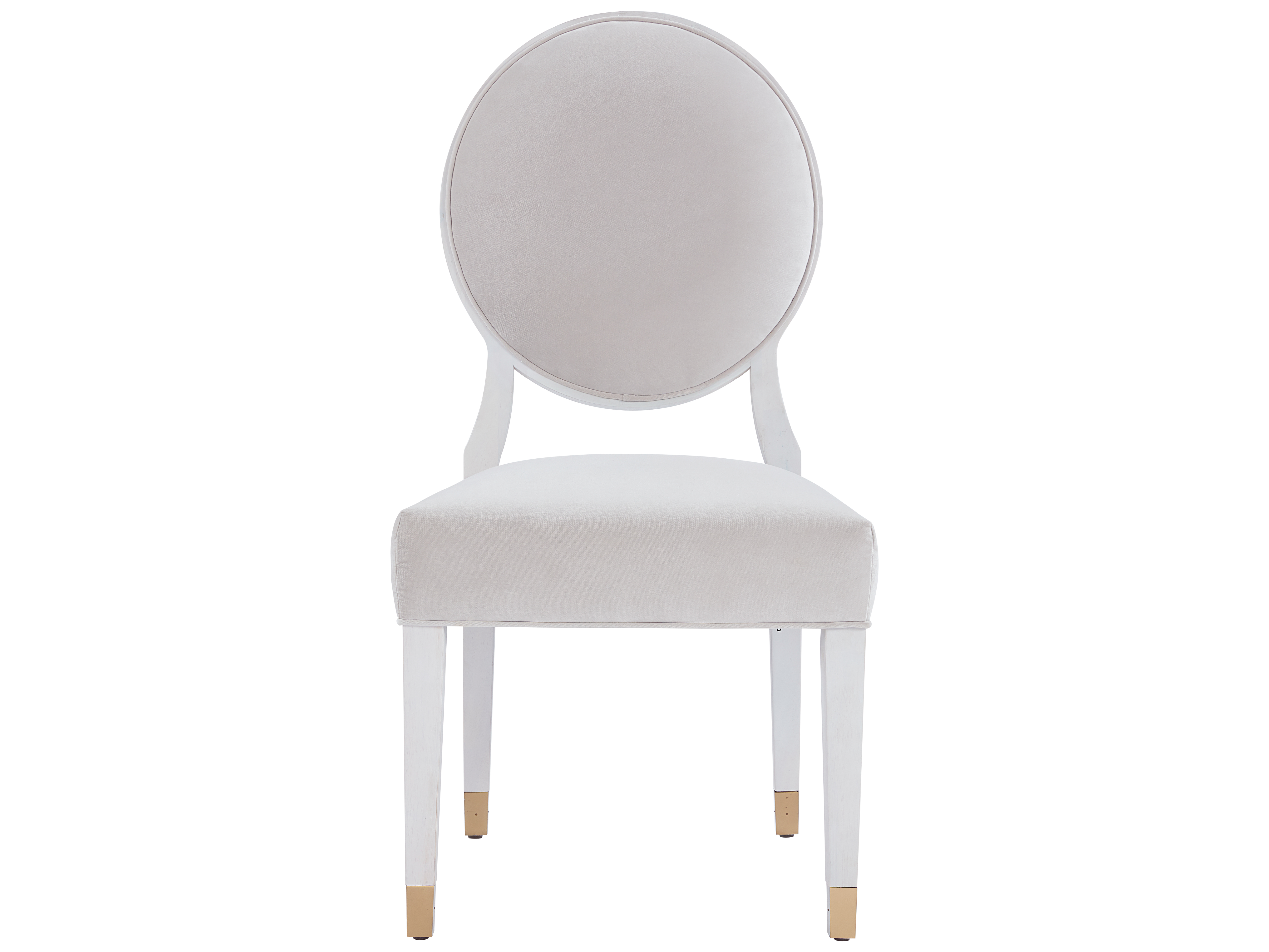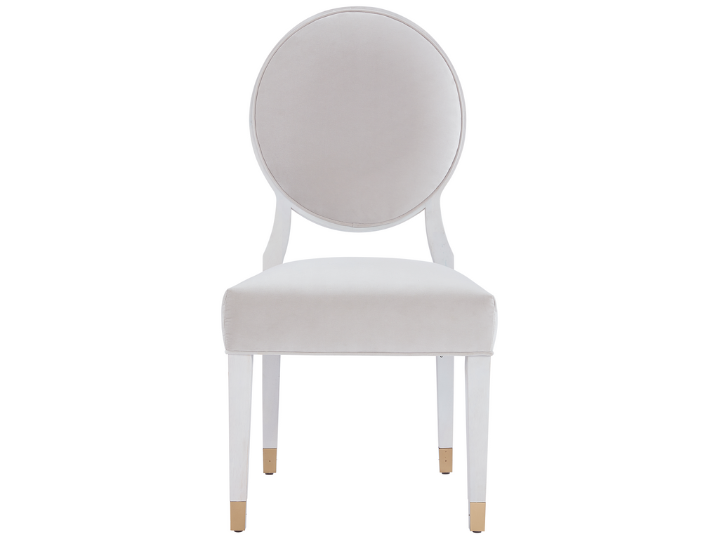 Boasting an exquisite rounded back, an upholstered seat, and soft gold metal caps on each leg, the Love Joy Bliss Oval Side Chair is a luxe seating choice.