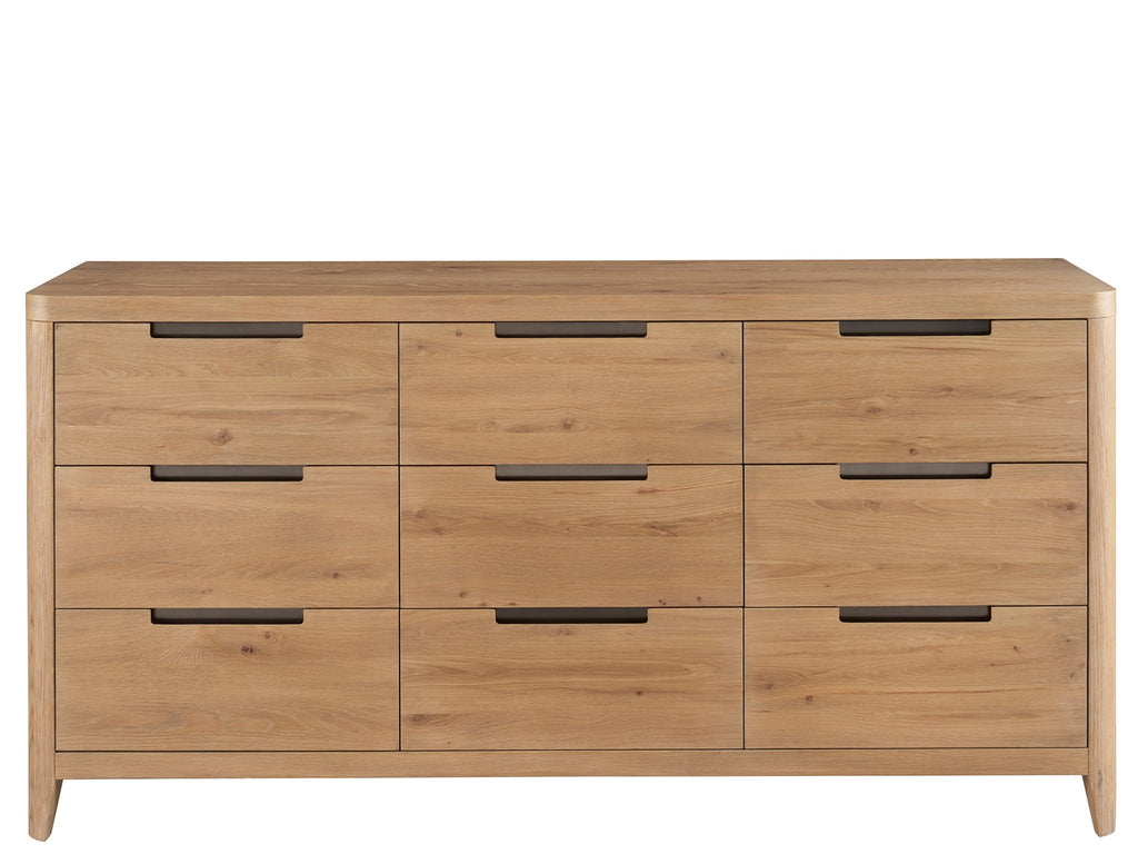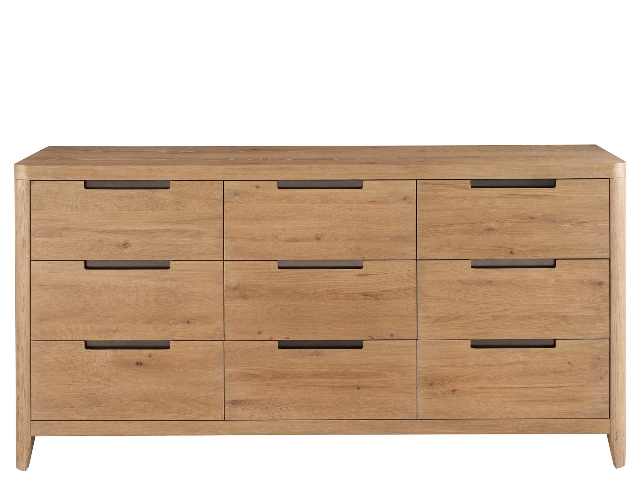 The Walker Drawer Dresser boasts nine drawers and is Finish:ed in an organic Natural Oak, offering a versatile and dynamic piece that's as functional as it is aesthetically pleasing. Its natural Finish: highlights the inherent beauty of the wood, making this dresser a timeless addition to any bedroom seeking a blend of practicality and natural elegance.