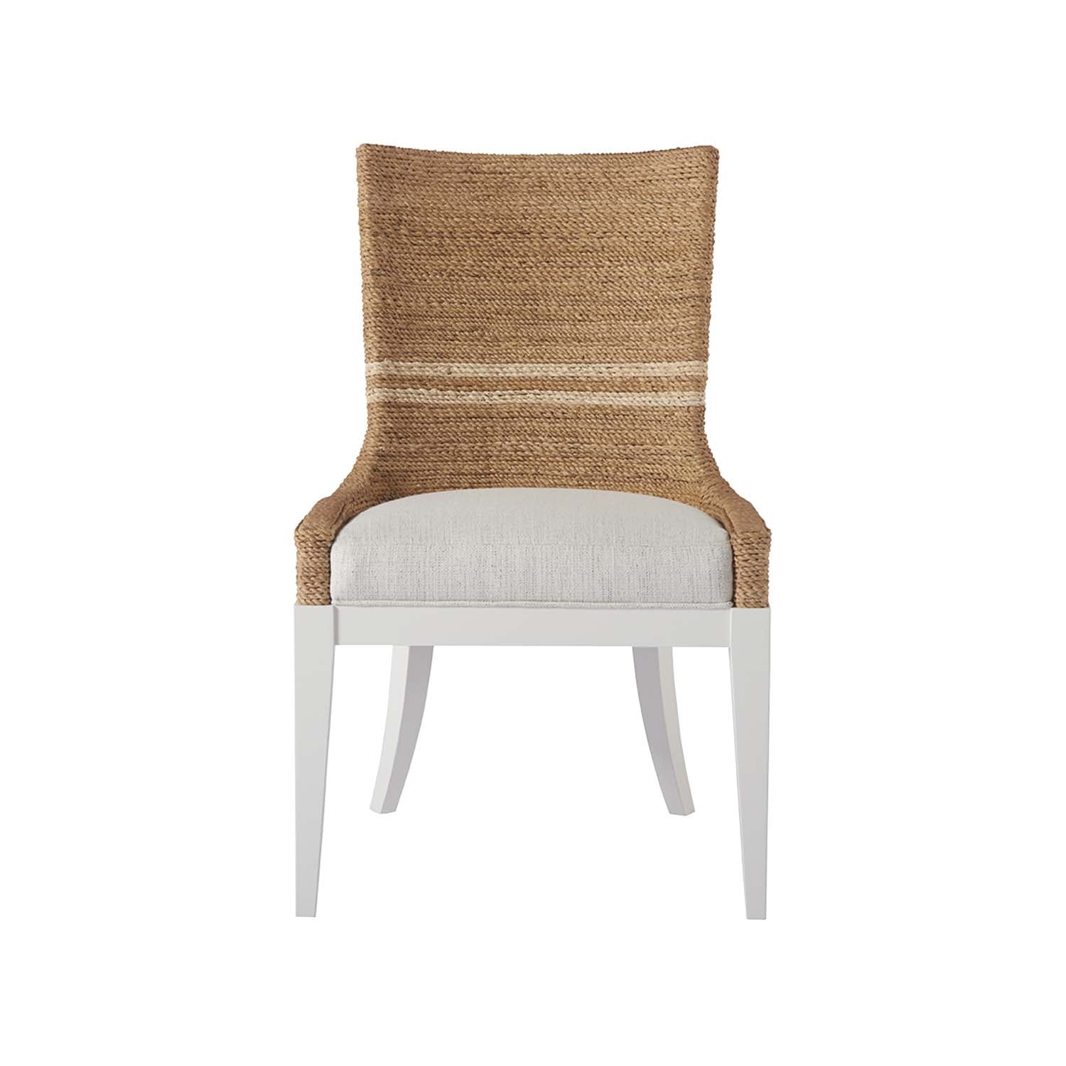 A gorgeous fusion of texture and tone, the Siesta Key Dining Chair is crafted with a natural woven abaca back, a cozy upholstered seat, and finished with chicly tapered legs in a white finish.