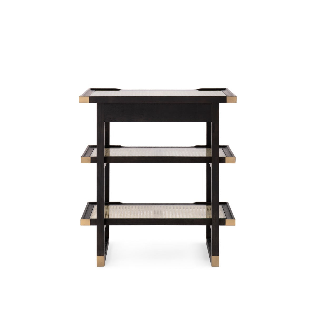 The Austin collection is influenced by traditional Japanese furniture design which emphasizes simplicity, natural materials, and understated natural finishes. The silhouette is reminiscent of traditional Japanese architecture with strong horizontal elements, while the hand-woven cane shelving, bronze-accented corners, and hand-carved grooving, which surrounds the top, speak of fine workmanship. Integrated concealed drawers maintain the integrity of the design and the glass shelving sits atop the woven cane protecting it and imparting airiness to the piece.28w x 16.5d x 32h