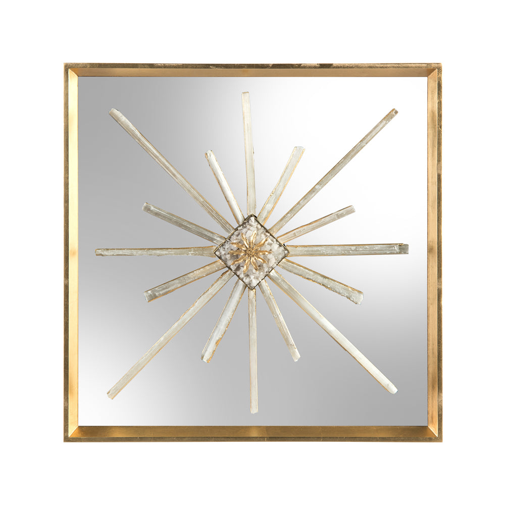 Elegant streams of selenite enhanced with gold leaf radiate from a quartz and brass-enhanced diamond embellishment. The mirrored background and gold frame add to the brilliance of this star.