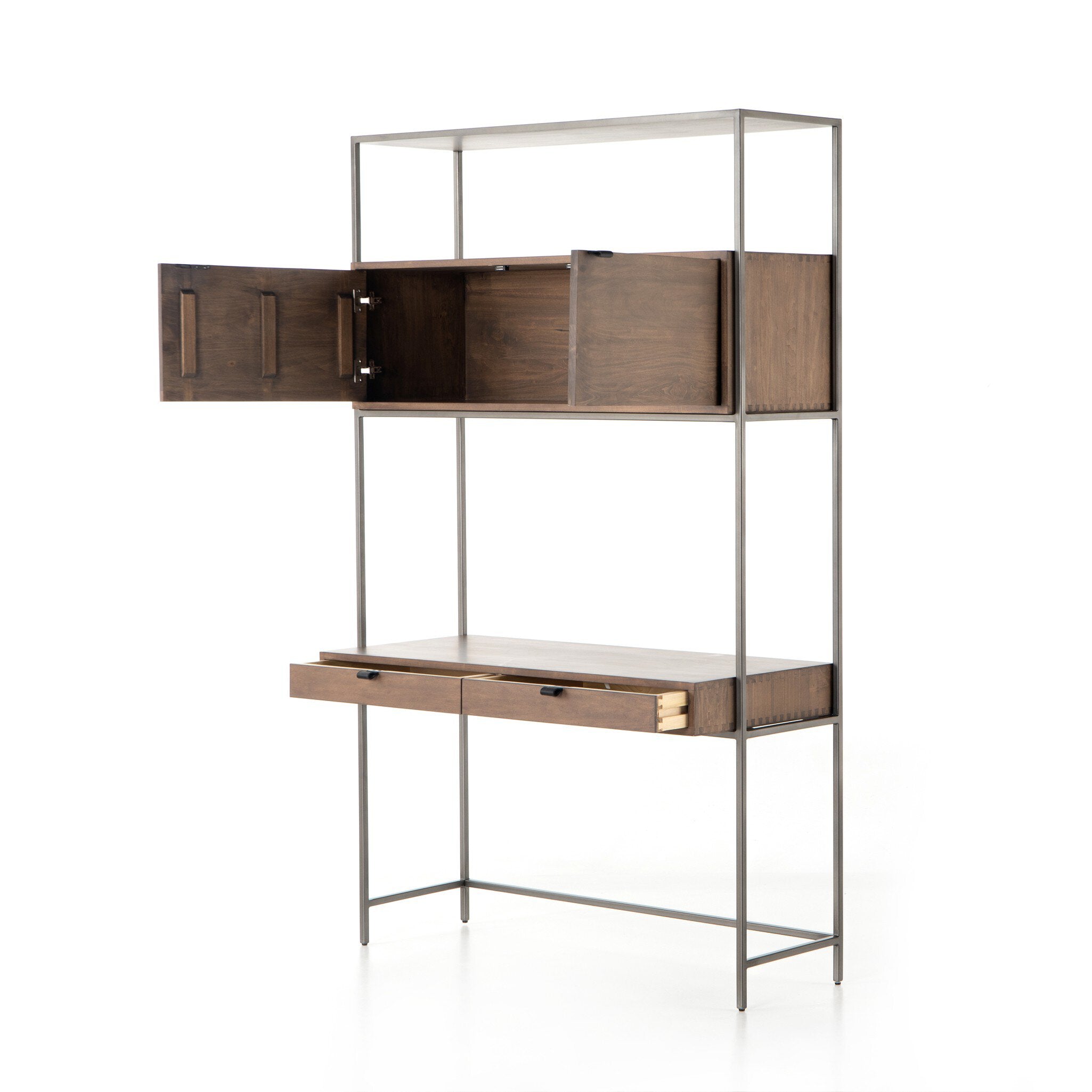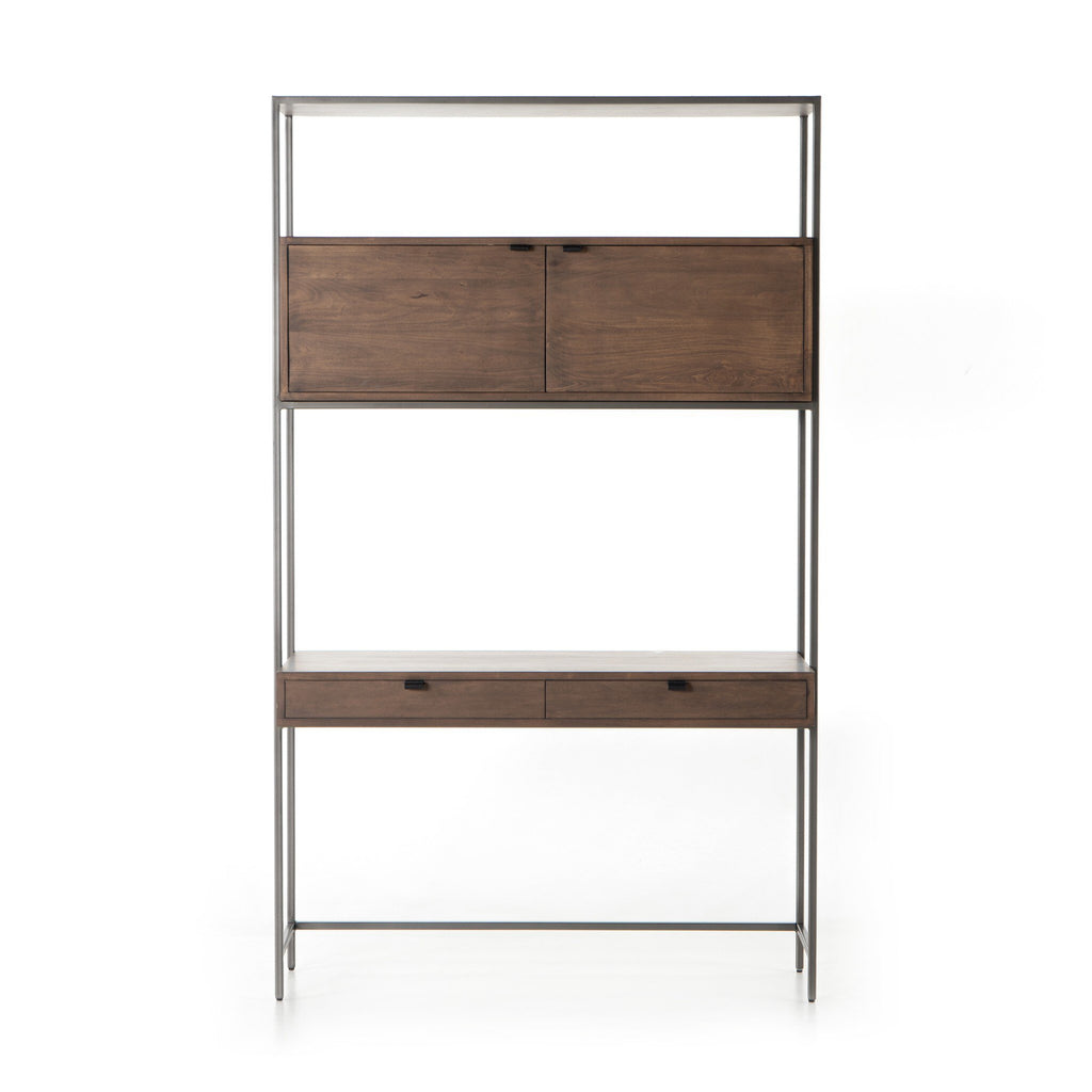 A mid-century-inspired design, greyish-auburn poplar and raw iron fuse for a forward-thinking wall desk with modularity. Dual drawers plus upper cabinetry provide plenty of storage space, while metal-secured pulls of top-grain leather add a fresh element of surprise. Pair with matching bookcase to form a large-scale setup.
