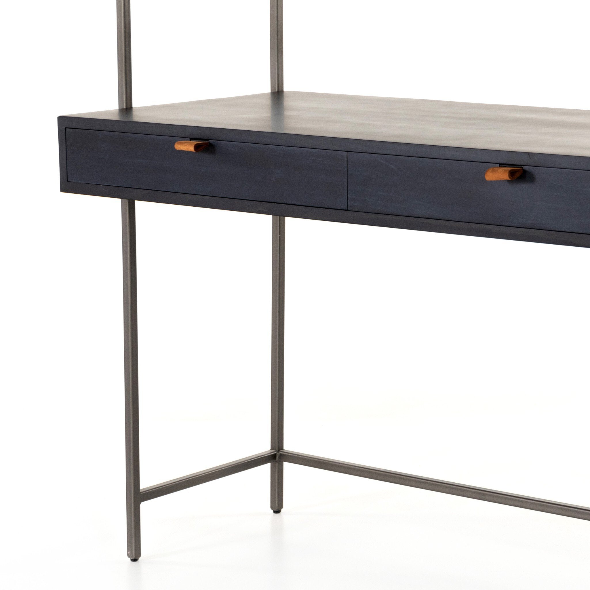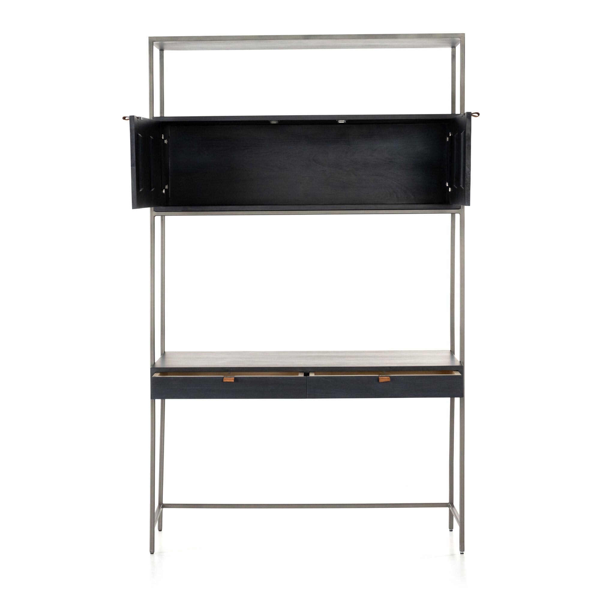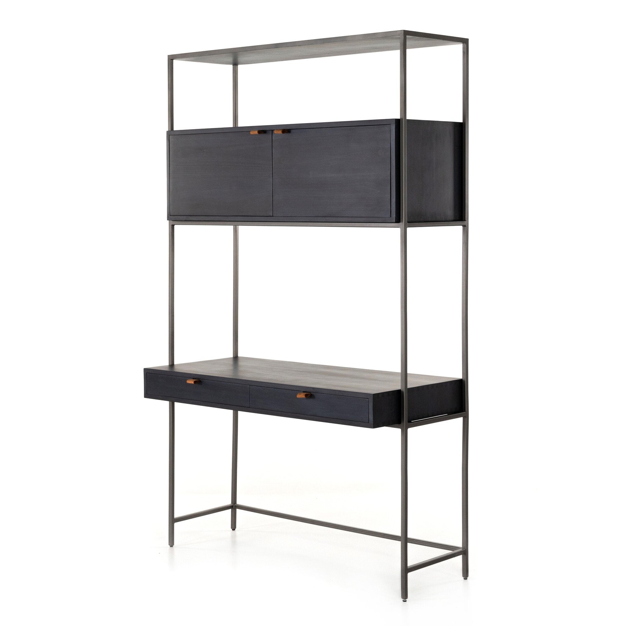 A mid-century-inspired design, black-washed poplar and raw iron fuse for a forward-thinking wall desk with modularity. Dual drawers plus upper cabinetry provide plenty of storage space, while metal-secured pulls of top-grain leather add a fresh element of surprise.