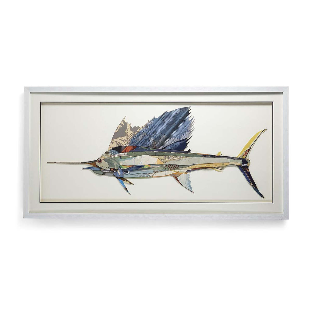 The spectacular swordfish Inside this white shadowbox is a collage inspired by vintage papers that go together beautifully. At just over 25 inches high, it's scaled perfectly to hang over the sofa. Don't let this be the one that gets away!