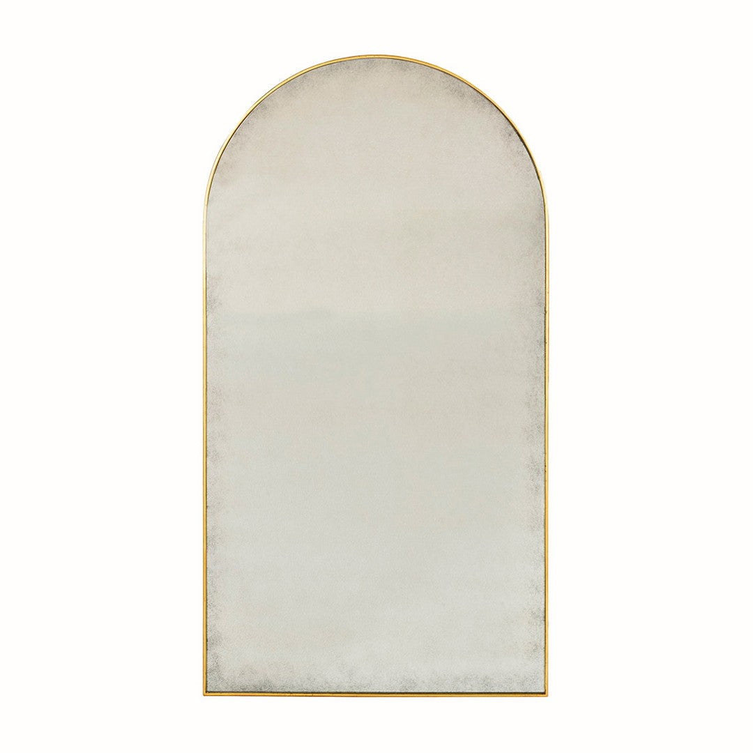Our Athens Mirror features a curved top, antique glass mirror with a metal frame and a French cleat mount.