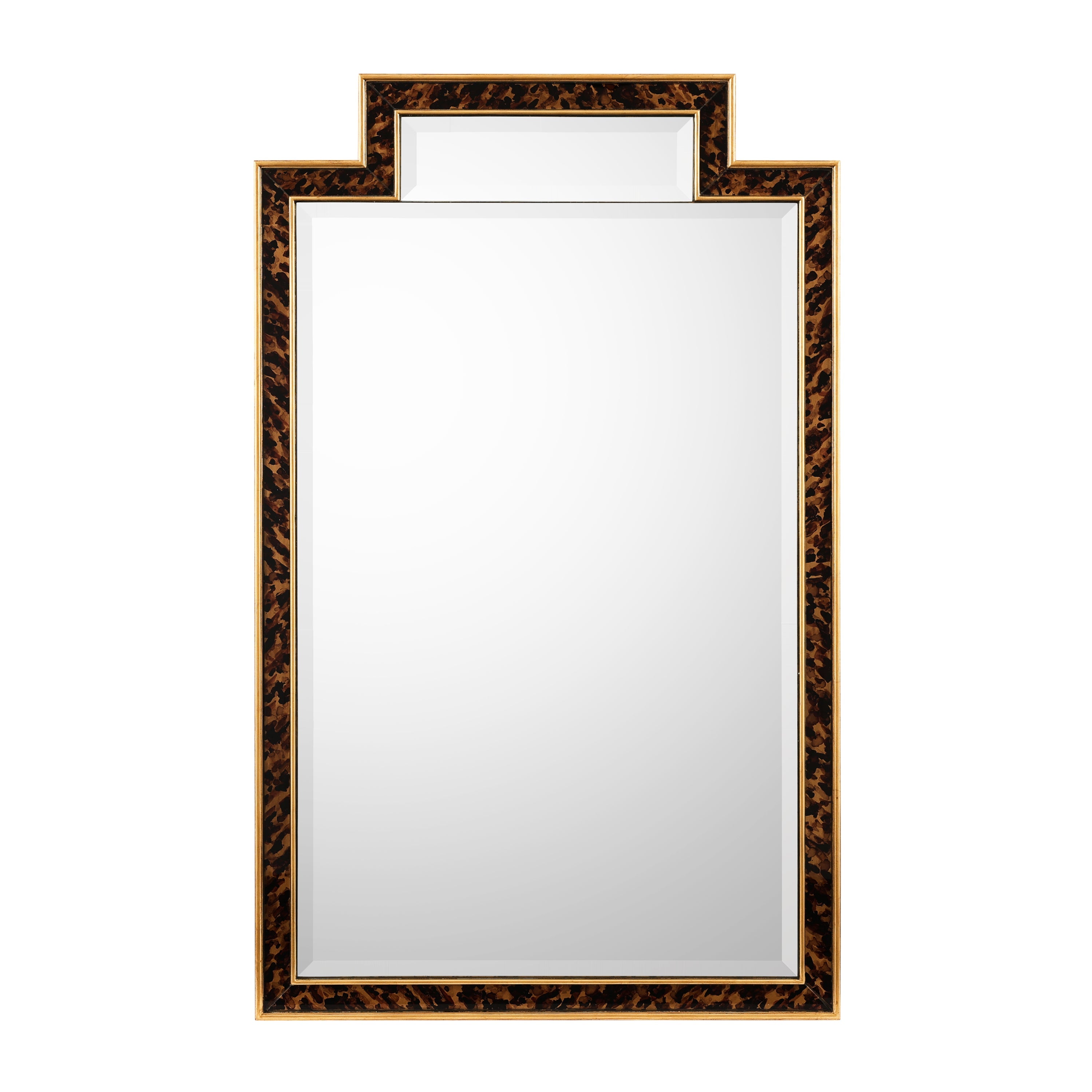 The Chelonia Mirror enhances gorgeous natural textures with opulent tones. Crafted from beech wood, the angular frame features a tortoise-like texture bordered by a stunning Gold Coast finish. This stylish beveled mirror is affixed with French cleats and may only be displayed from a vertical orientation.