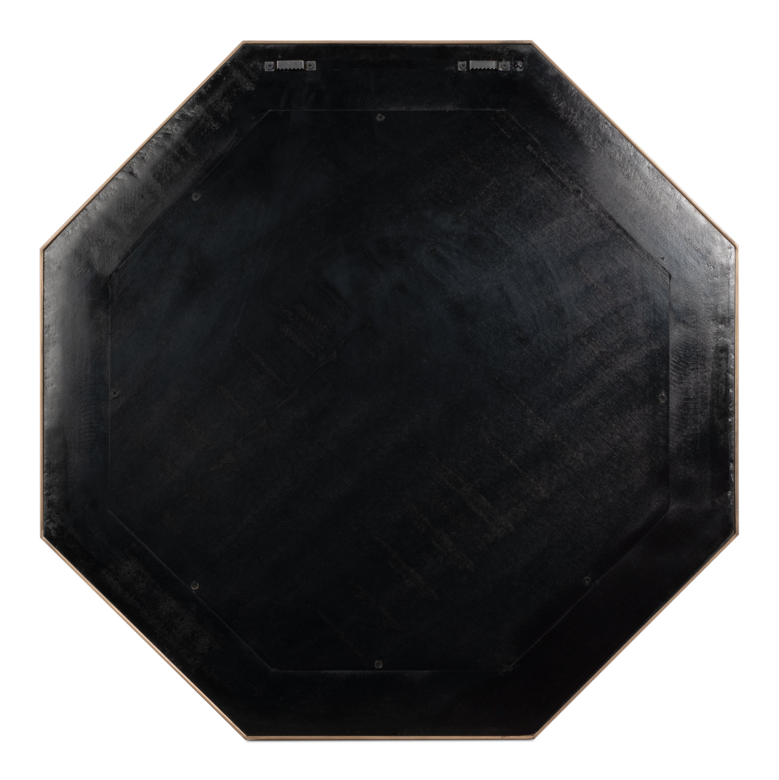 The octagonal frame of the chambray blue shagreen leather adorned with handcrafted brass details surrounds a beveled mirror, elevating the design and complementing any room with its timeless elegance.