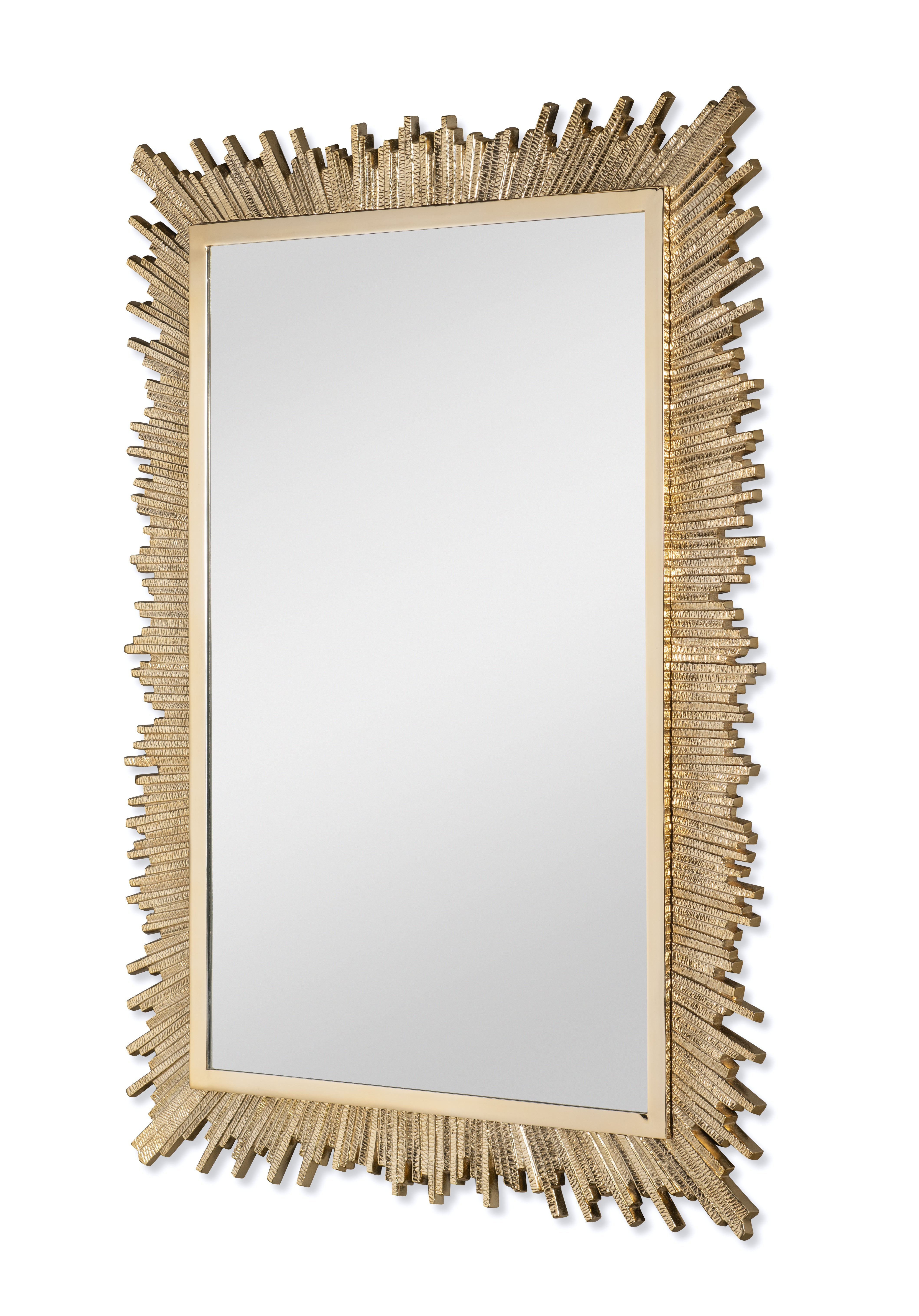 The Ember mirror features individual pieces of Antique brass framing cut at varying lengths surrounding a rectangular clear mirror field.