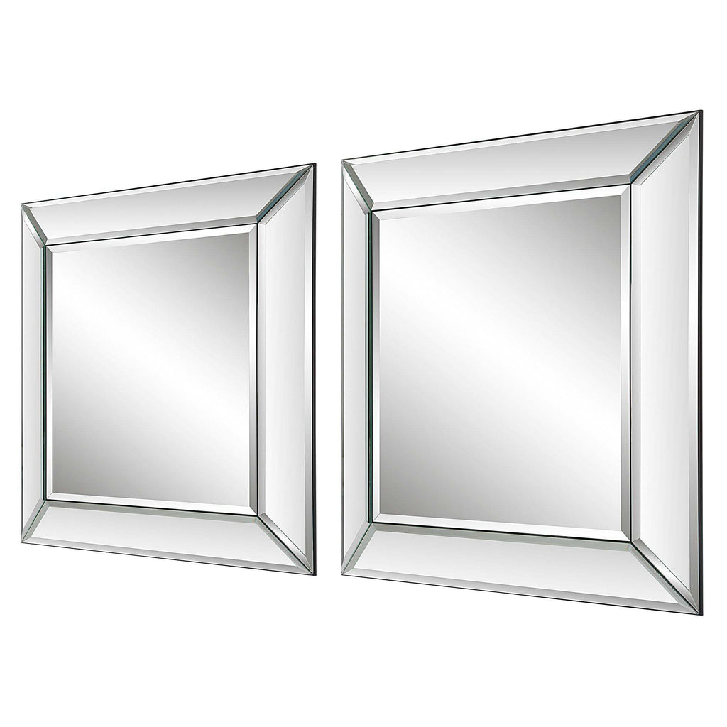 These elegant frameless mirrors feature beveled mirror panels, which are slightly sloped away from the beveled center mirror. Sold as a set of two, these frames are sized perfectly to be grouped together to create a beautiful wall display.