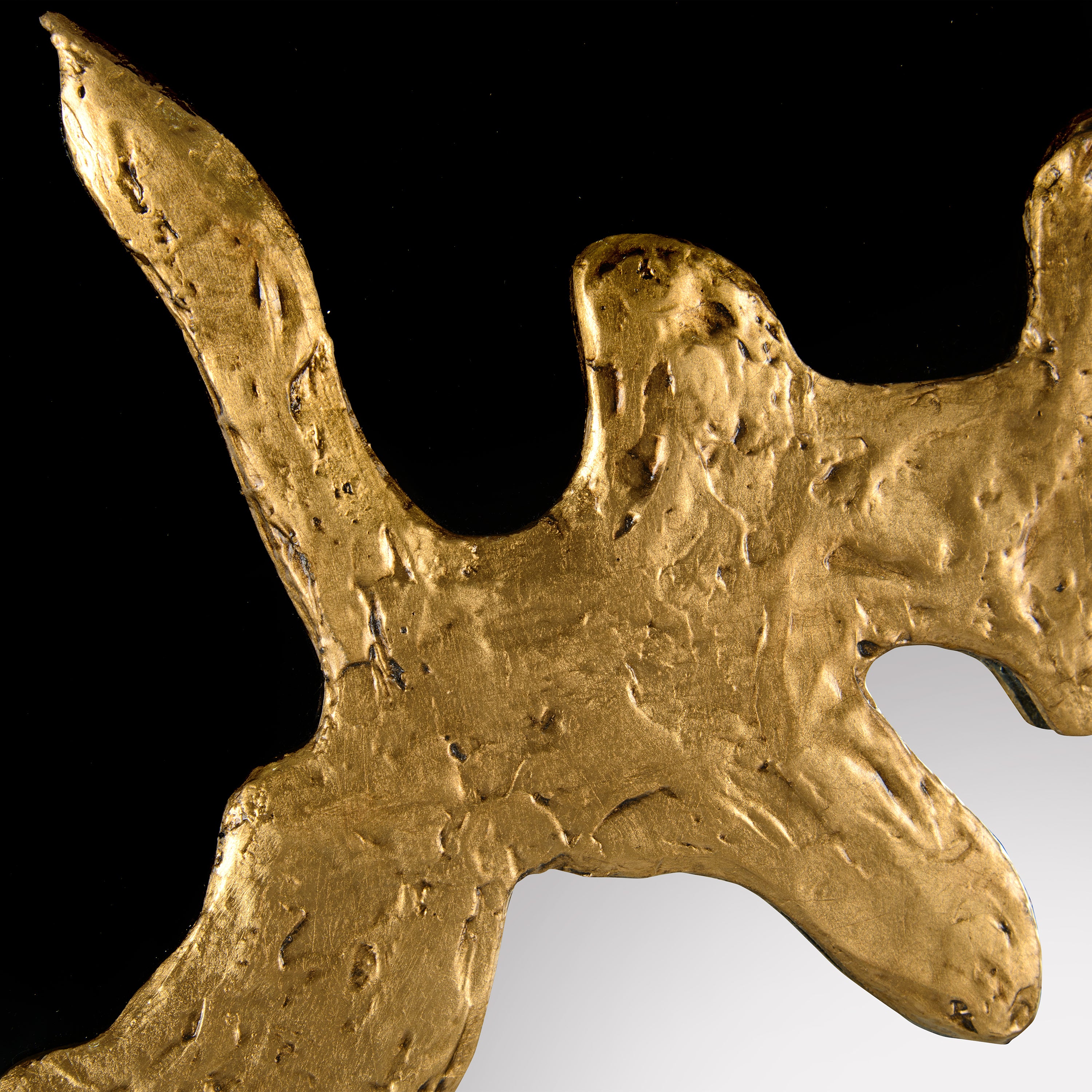 The Prominence Mirror embodies a radiant star projecting magnificent solar flares from all sides. Constructed from resin, the center ring is finished in an opulent Gold Coast, with black reverse-painted glass acting as a striking backdrop. This gorgeous statement piece achieves a delicate balance of expression and restraint, resulting in a tasteful work of art that sparks the imagination.