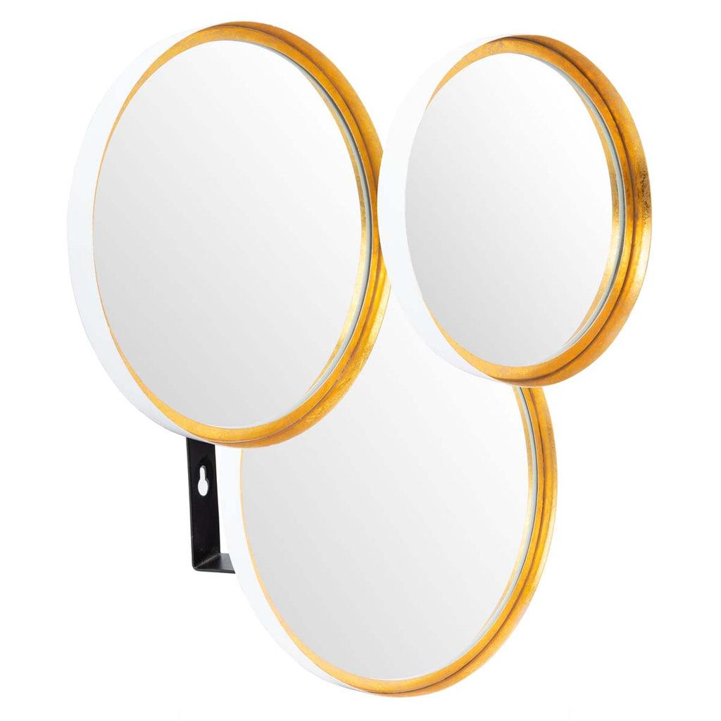 The layered dimensions the Loni Mirror is an artistically vogue trinity of mid century mod style. The depth and drama of Loni is enhanced by its shimmering white and gold foil stripes, making this chic home accent accessory a high fashion addition to any living room, bedroom, or entryway.