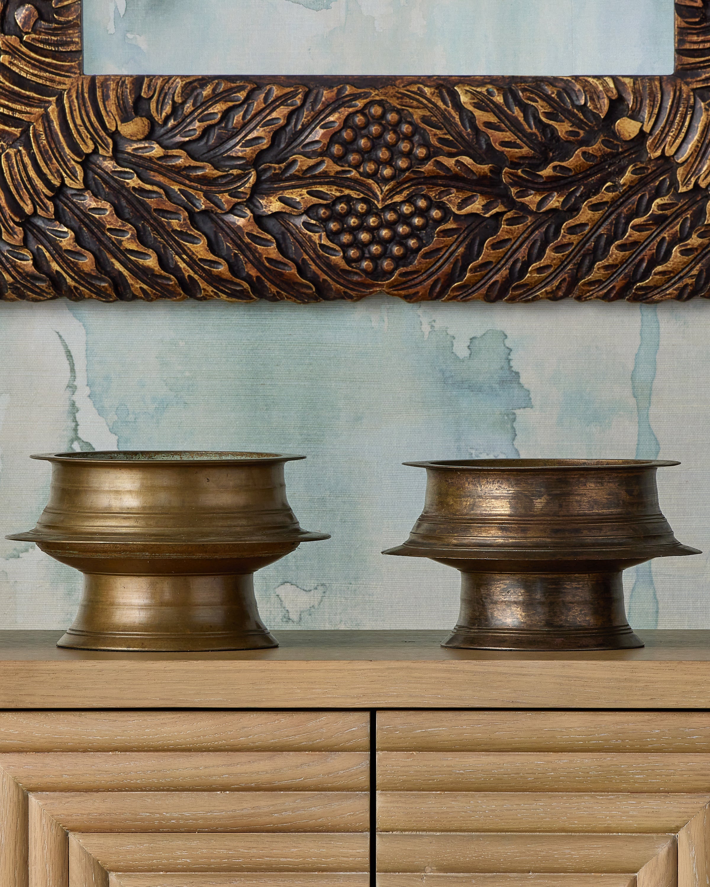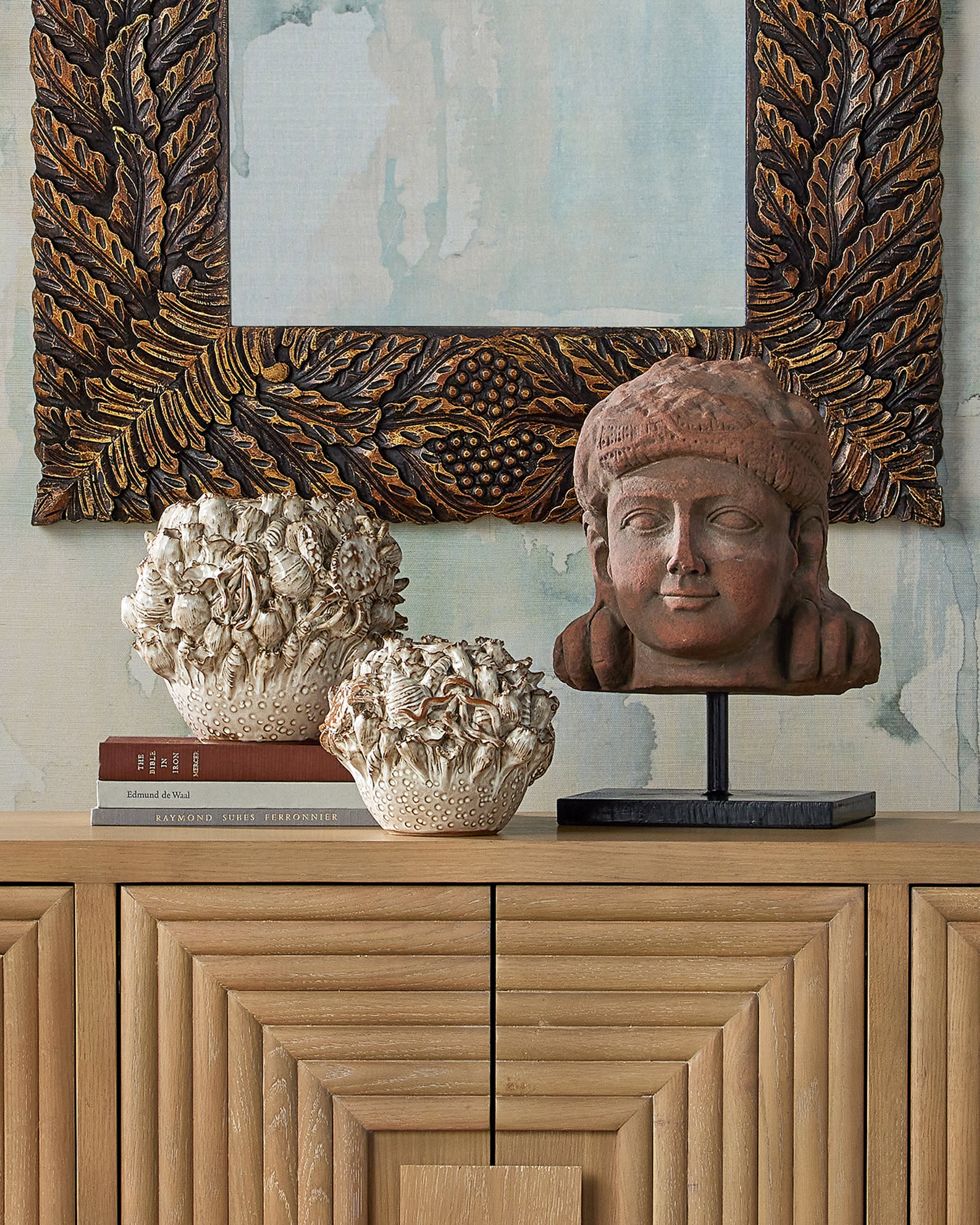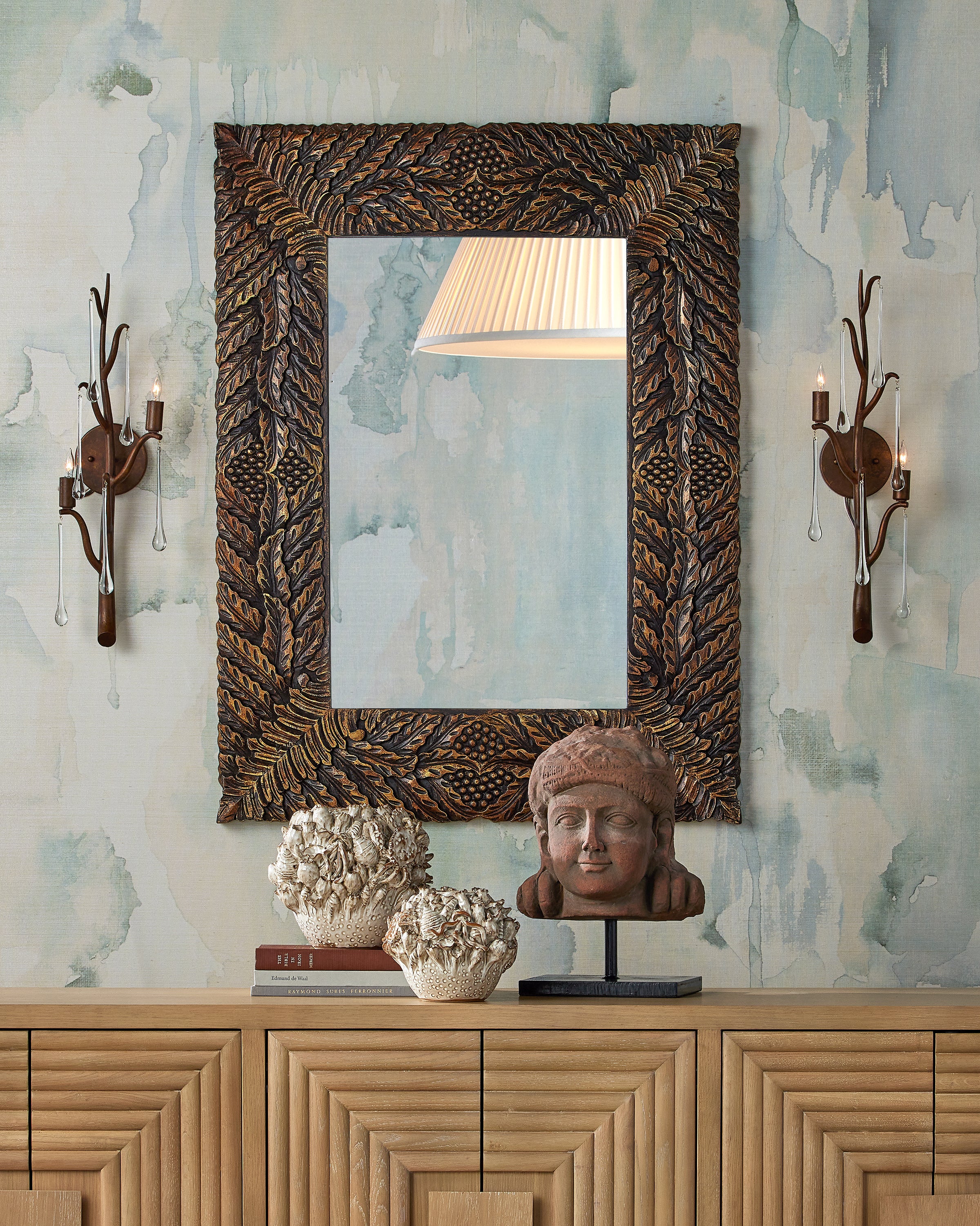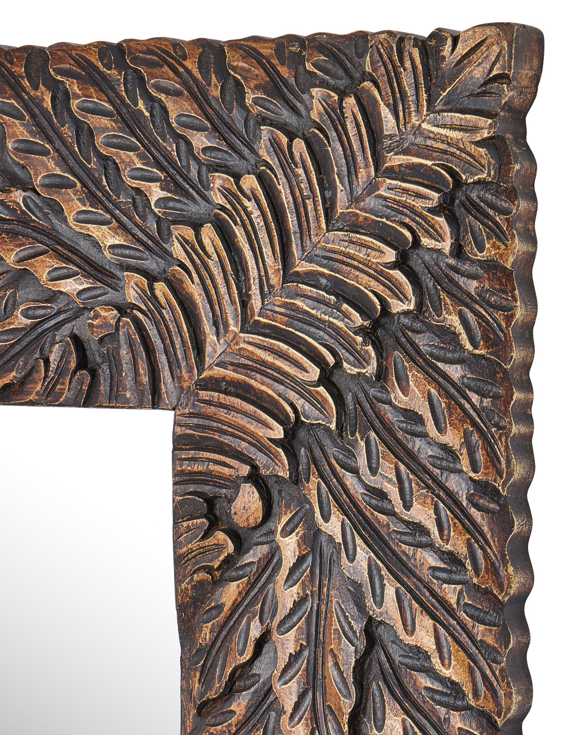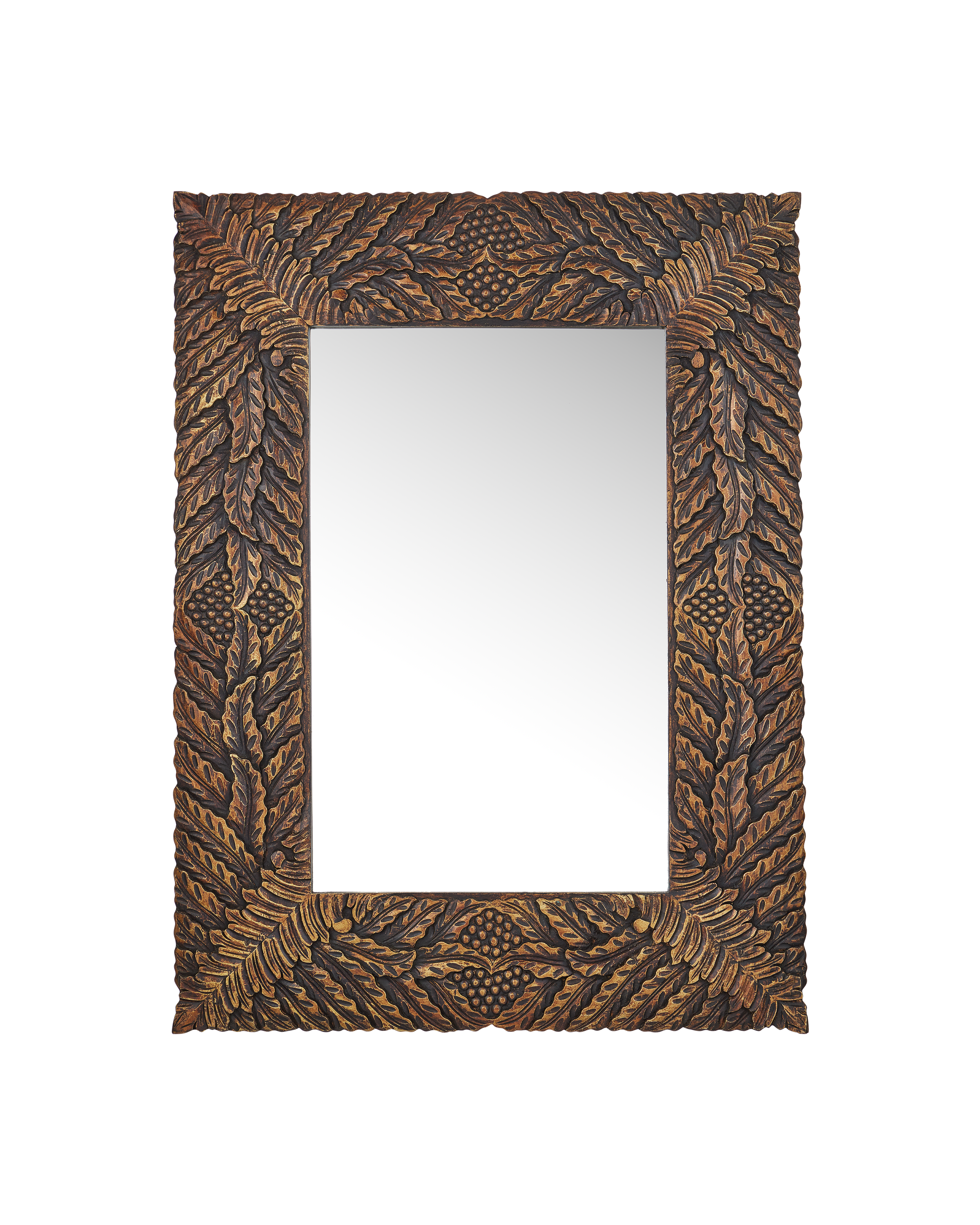 The Currey & Company Schwarzwald Mirror has a carved wood frame with pomegranate and acanthus leaf motifs.