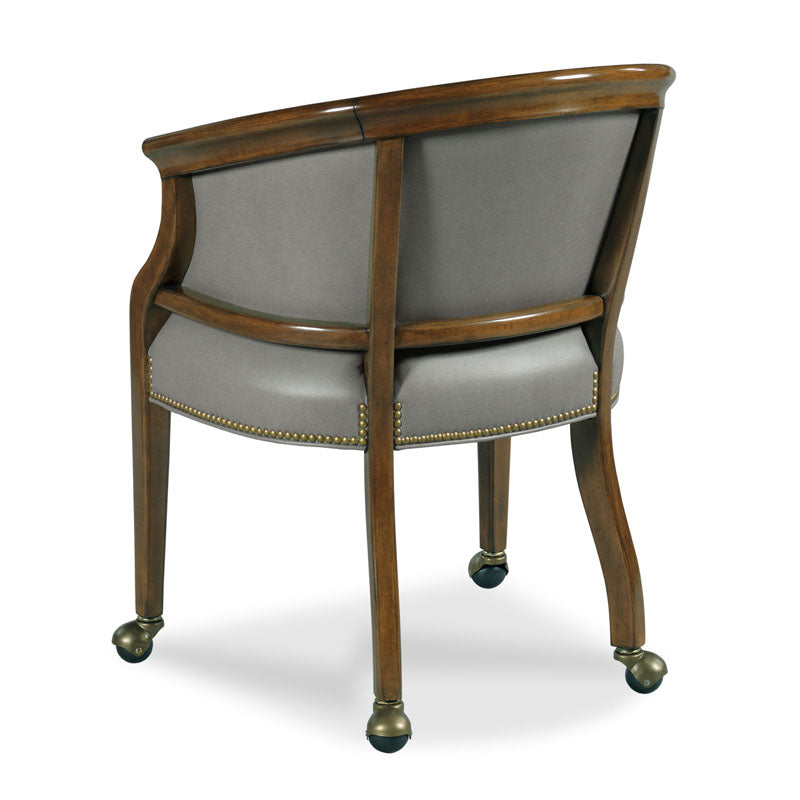 This chair features a curved crest back rail that transitions to sloped arms, making it ideal for use as a game or café chair. The seat and back are upholstered in a standard gray vinyl from Wolf Gordon accented with brass nail head trim. The chair frame is elevated by four casters, allowing for easy and efficient movement.