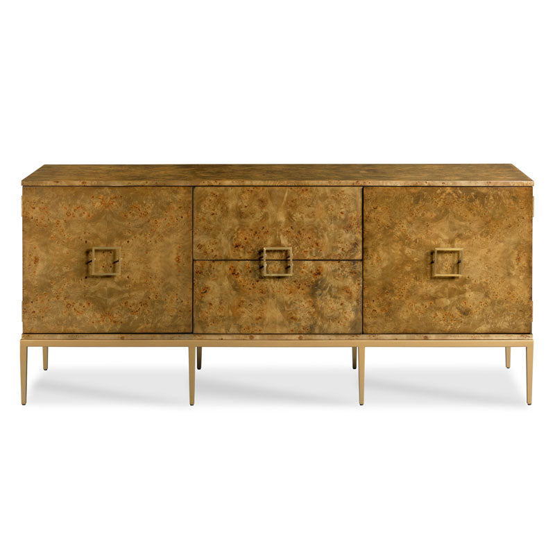 A striking and dramatic cabinet featuring a rectangular top is placed over a pair of doors that hide an adjustable shelf flanking two middle soft close drawers. The cabinet is mounted with squared brass pulls and elevated on a satin brass finish metal base of gracefully tapering legs.