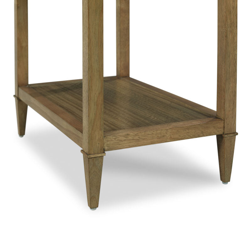A drink table with sophisticated metropolitan styling featuring a rectangular top placed over four shaped tapering legs that are joined by a low shelf.