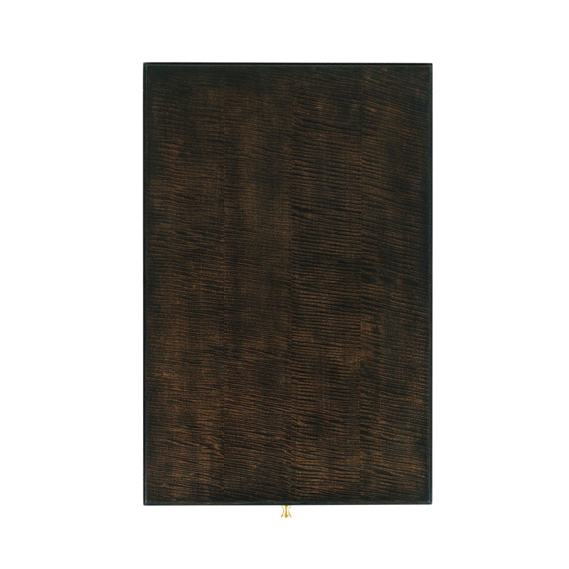 A graceful design with neo-classic style roots amended to have a modern attitude. A rectangular eucalyptus veneered top is elevated by graceful tapered corner posts that are joined by a low shelf. The table is accented with brass molded details.