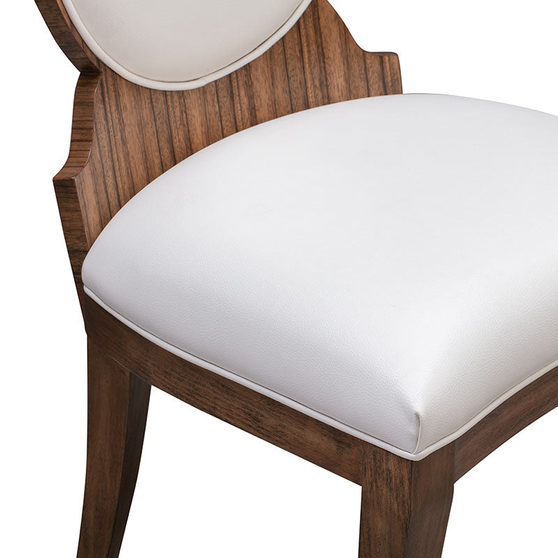 A curved oval upholstered back resides above an upholstered seat elevated on graceful tapering saber legs with a radial paldao veneer patterned outback.
