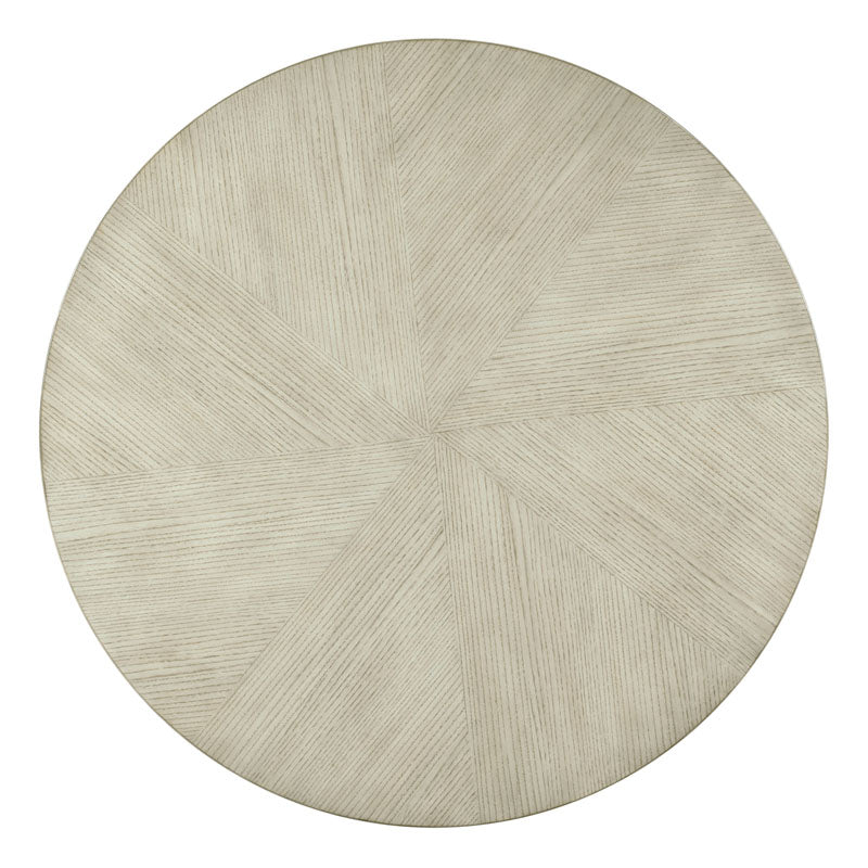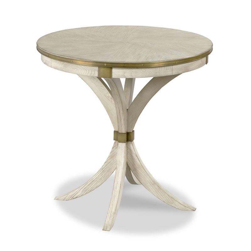 A circular top is veneered with quarter ash surrounded by a brass gallery. Elevated by curvaceous saber legs joined by a middle brass binding.