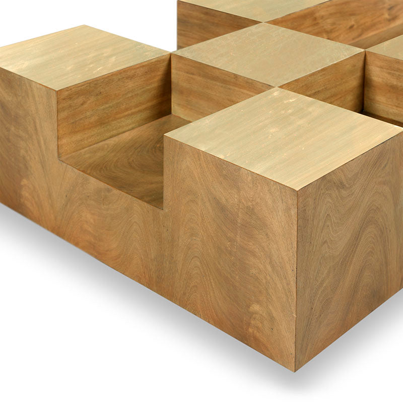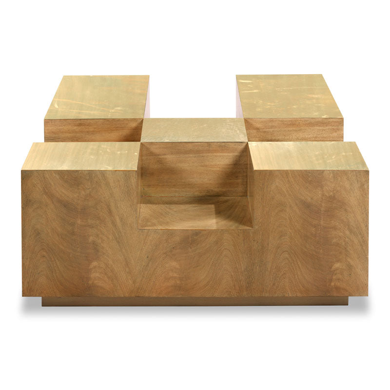 A curious modern low table elevated on a recessed plinth base with unlacquered brass panels on top and recesses for books or display below.
