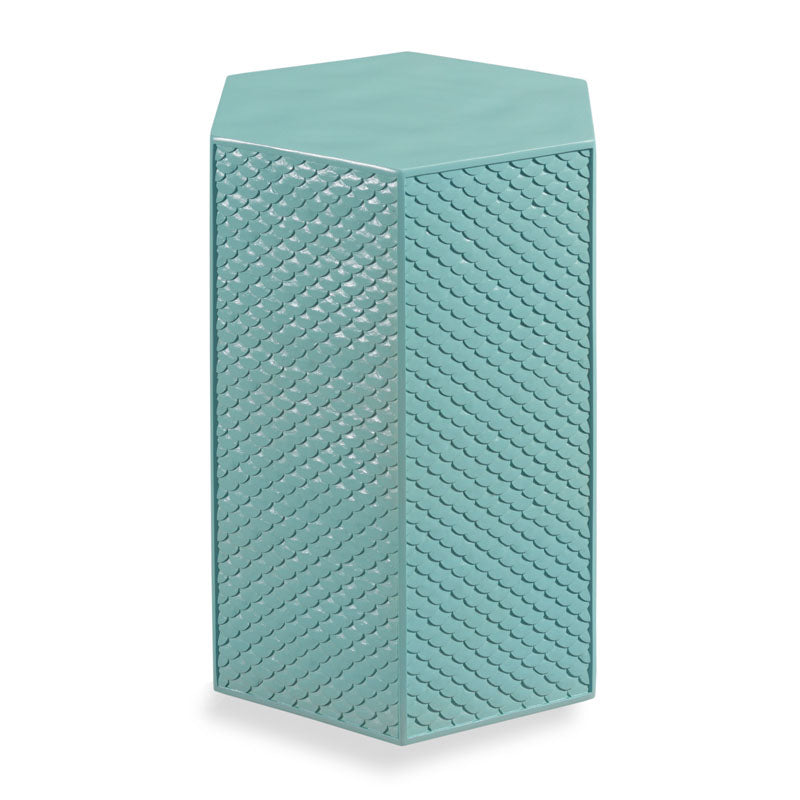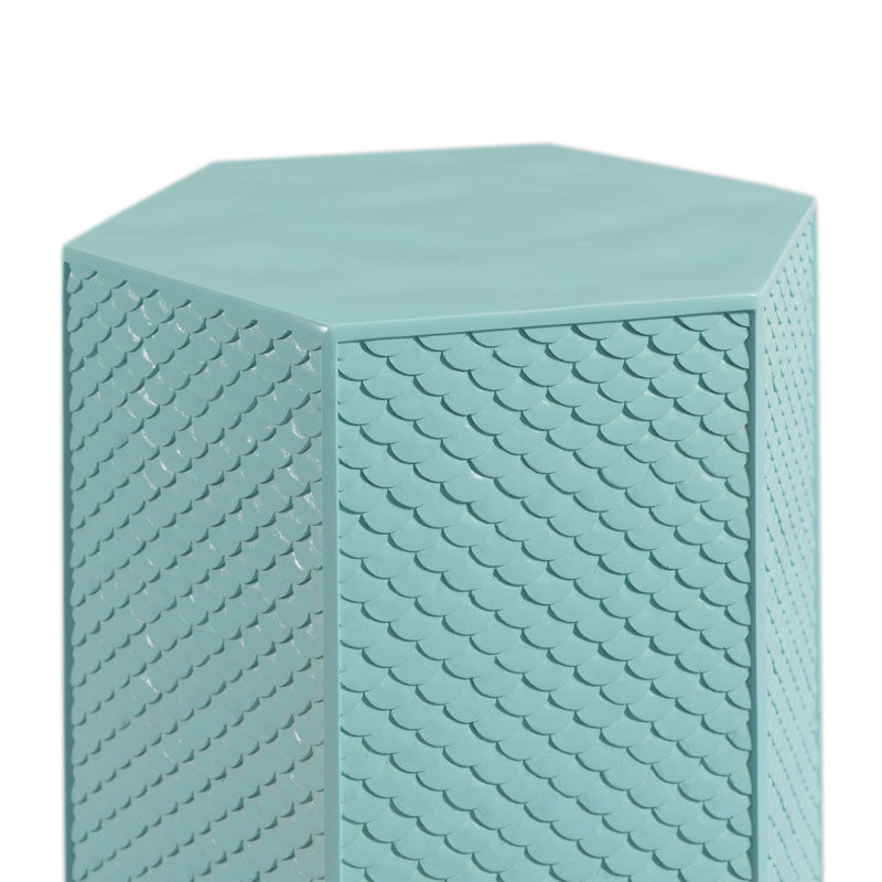 A funky side table for drinks with a hexagon shaped top over 6 sides with a cast fish scale pattern.