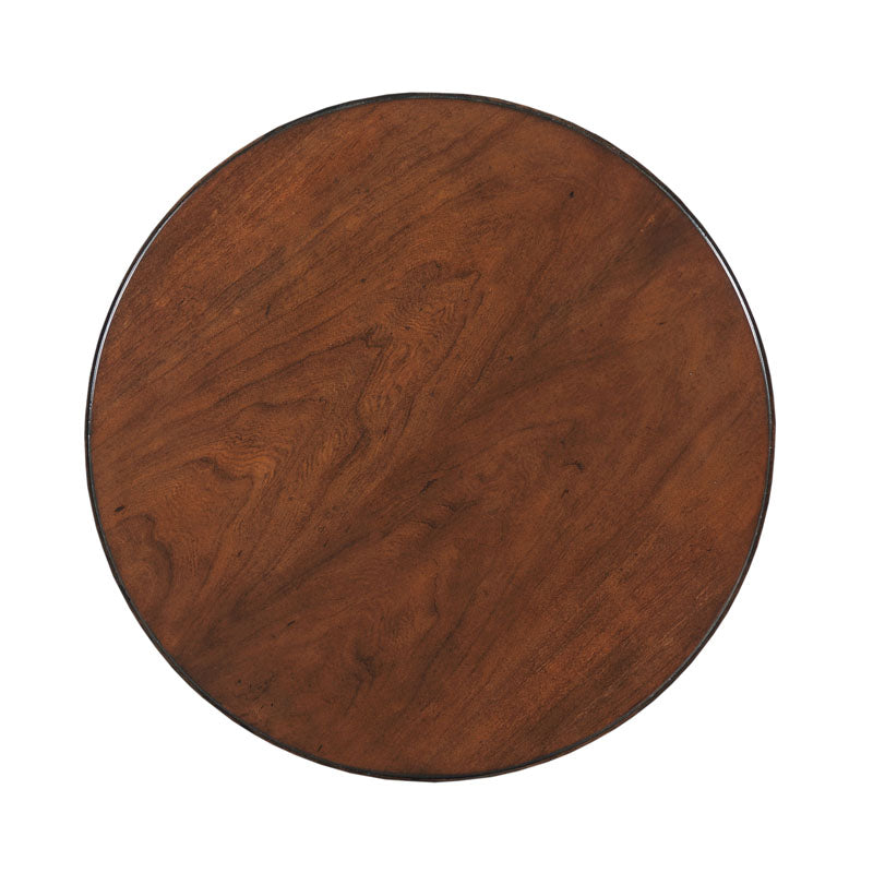 A graceful table with neo-classic roots has a round top resting over four squared tapered posts joined by a middle shelf.