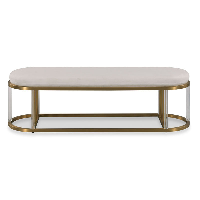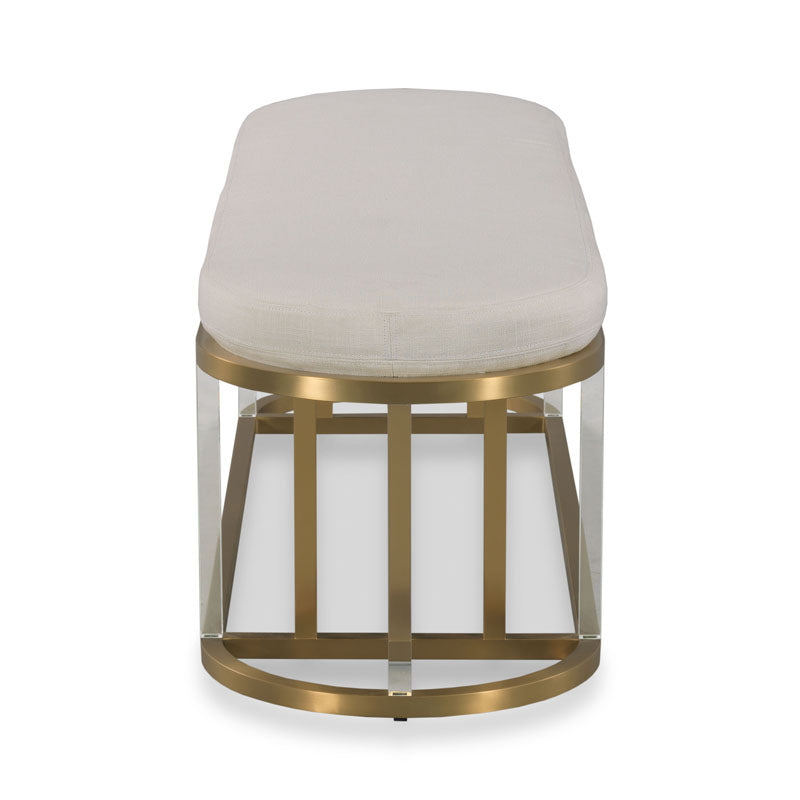 This unique modern design has a racetrack shaped upholstered cushion over a brass rail that is fitted with a colonnade of six lucite square posts over a brass base.