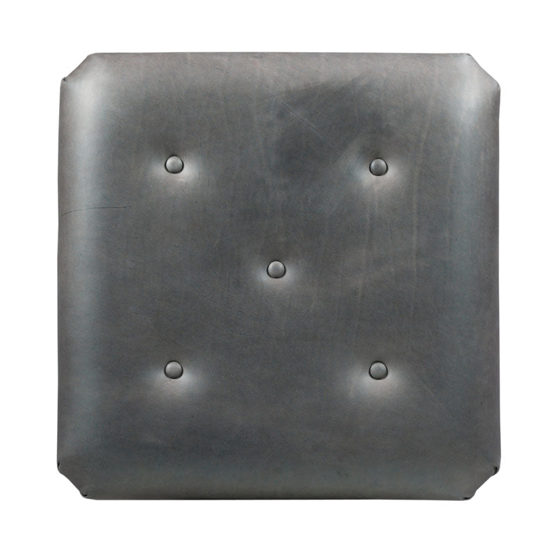 A squared cushion is accented with tufted leather upholstery over molded rails and canted tapering saber legs that terminate to brass sabots.