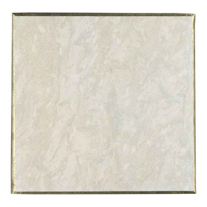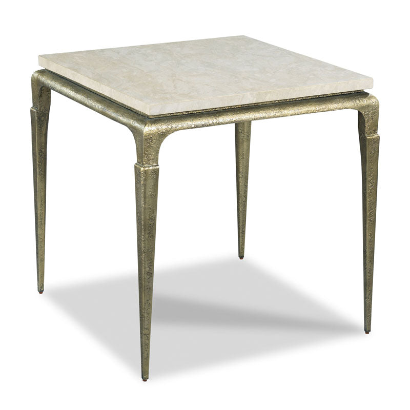 A square Spanish Marble top rests over a handsome and sturdy textured metal base with graceful tapering legs.
