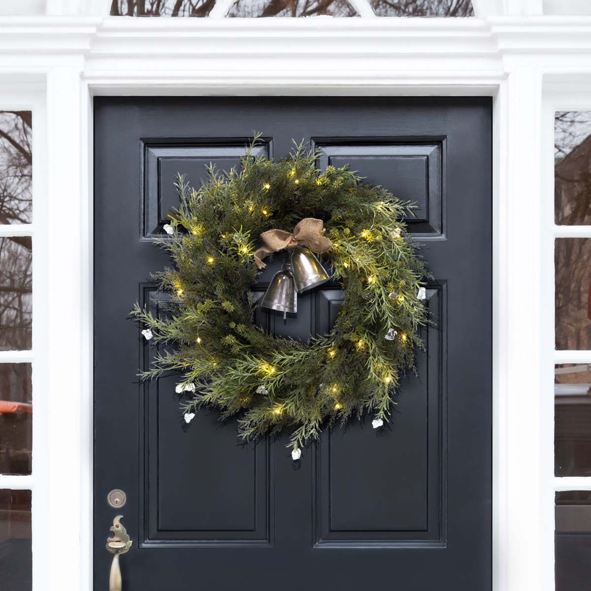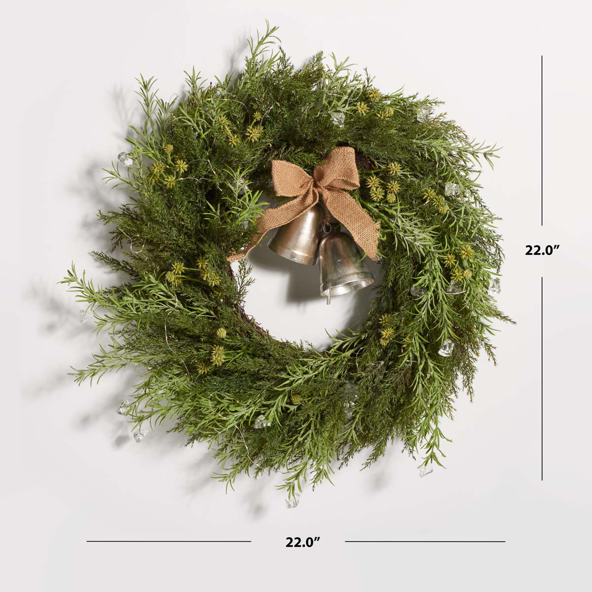 Give a warm and heartiest welcome to your guest this holiday season with our faux pine LED wreath with gold bells. The lush green foliage receives a festive upgrade with gleaming gold bells. Each texture and detail is realistically rendered to give a sophisticated festive look to your home. Our holiday wreath features LED lights to create a radiant Christmas display upon your door, mantelpiece, or dining table.