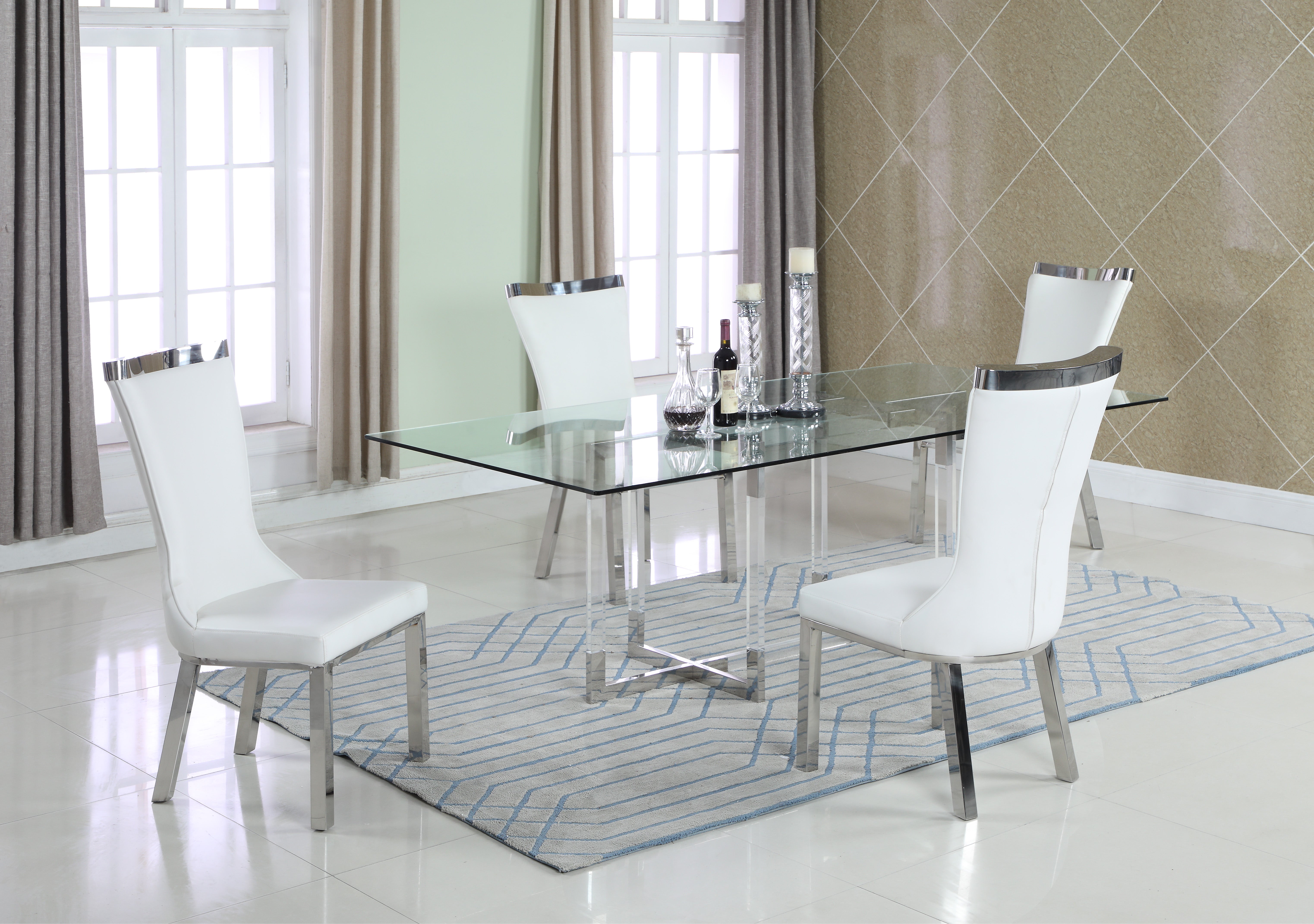 This dining set features a rectangular glass table top with a solid acrylic and polished stainless steel trestle frame and base. The 4 curved-back chairs have a white faux leather upholstered seat on a polished steel frame.