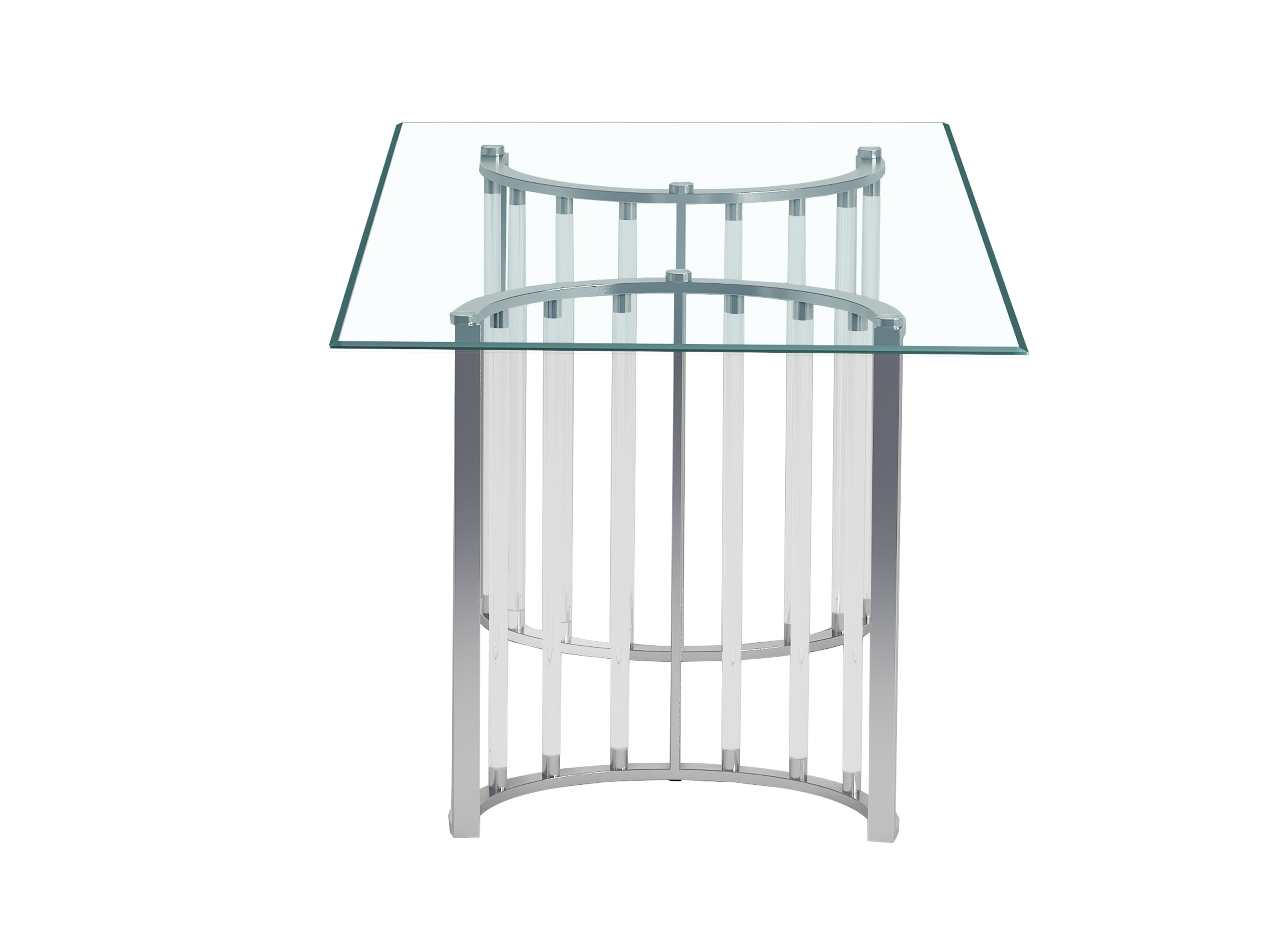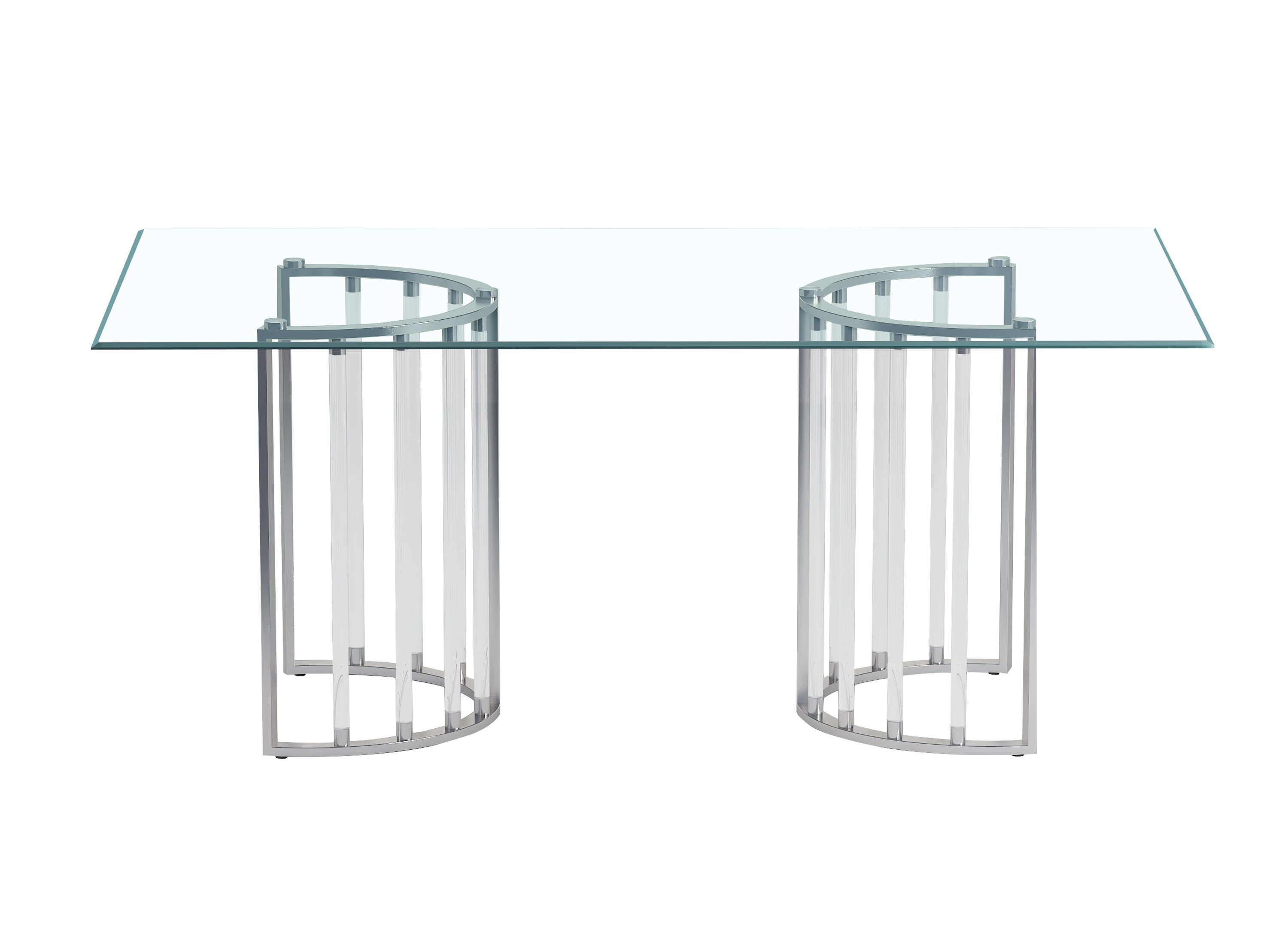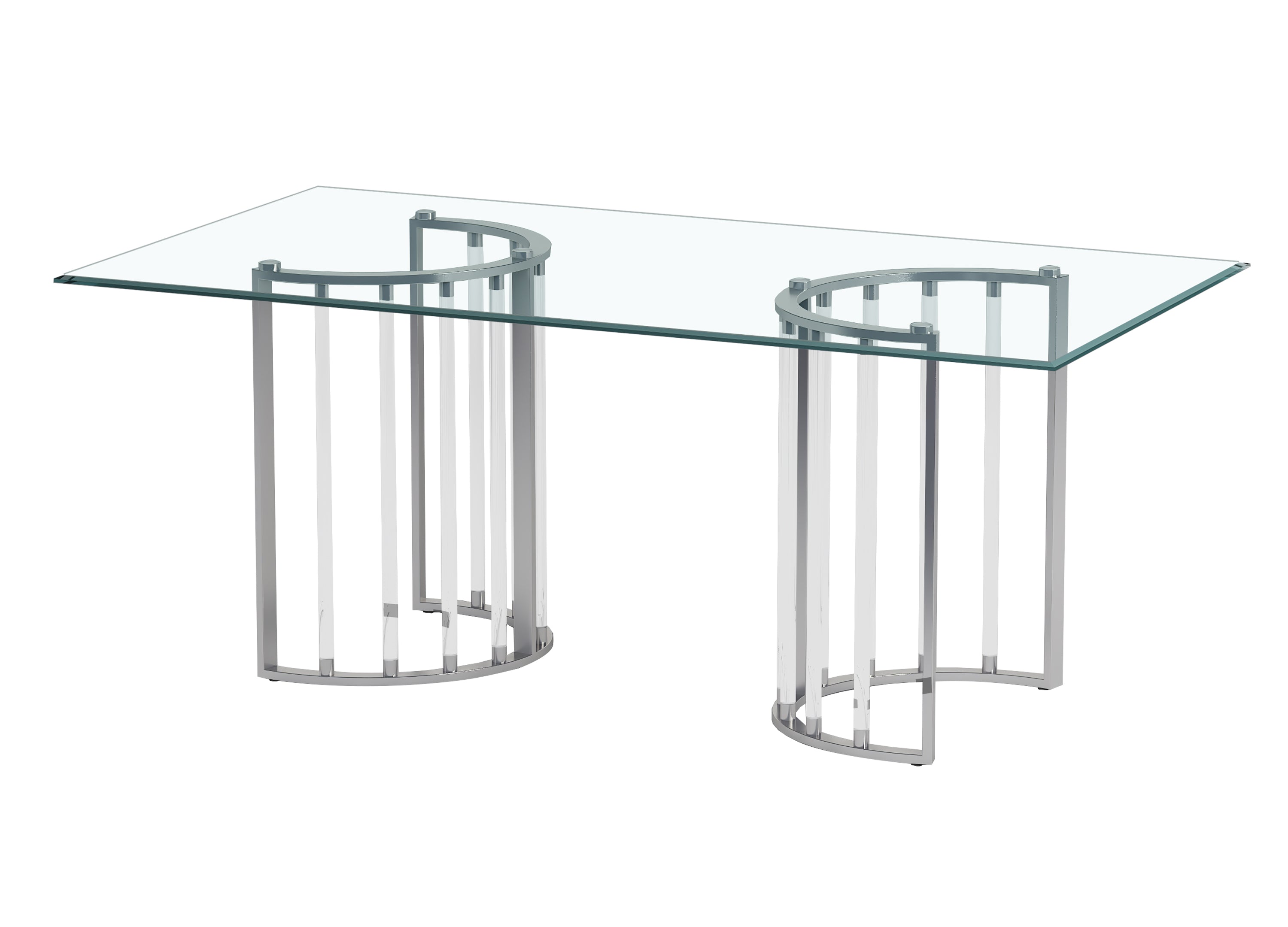 A contemporary dining must-have, this 42" x 72" rectangular clear glass dining table is sure to take your dining area to the next level. Set atop two semi -circle base pieces, the steel and acrylic features will add a polish you're sure to appreciate.