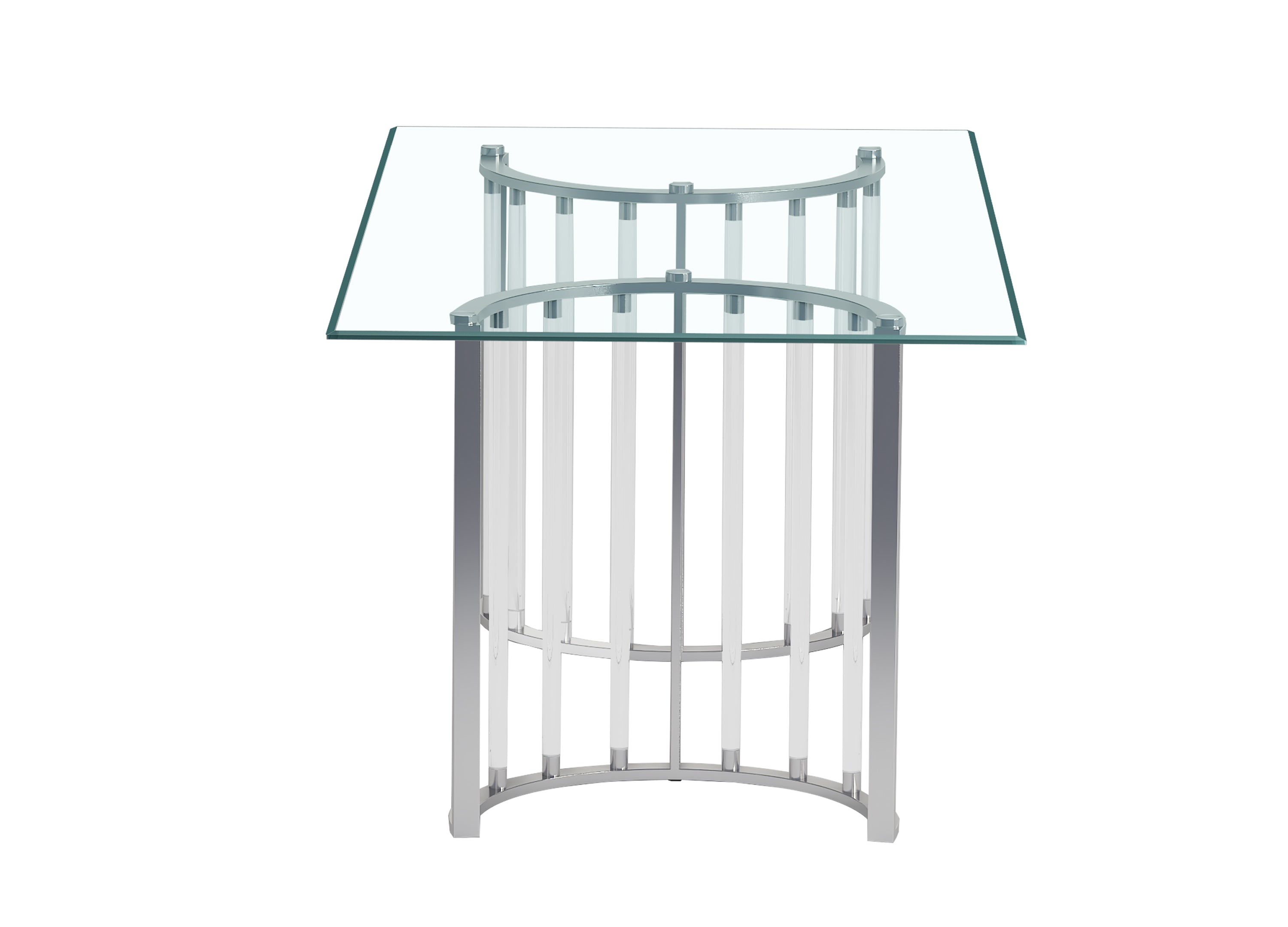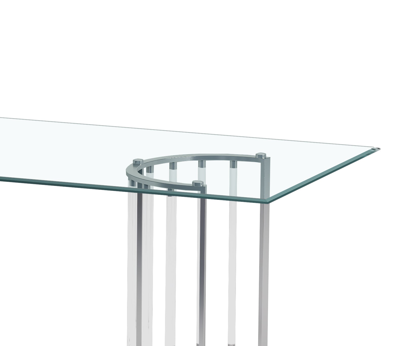 A contemporary dining must-have, this 44" x 84" rectangular clear glass dining table is sure to take your dining area to the next level. Set atop two semi -circle base pieces, the steel and acrylic features will add a polish you're sure to appreciate.