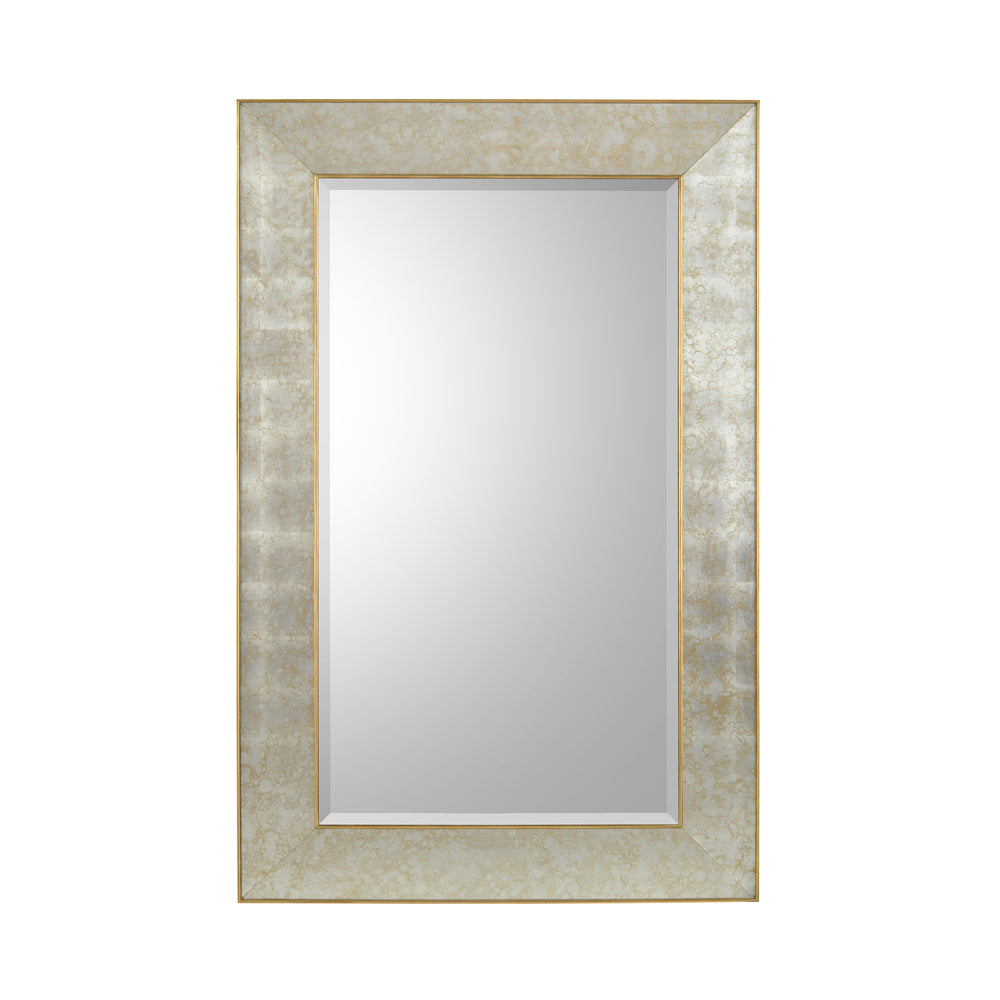 A modern beveled mirror is framed with a reverse-painted eglomise frame in antique champagne pattern and a cock bead molding in antique gold leaf. This mirror is designed for portrait or landscape orientation.