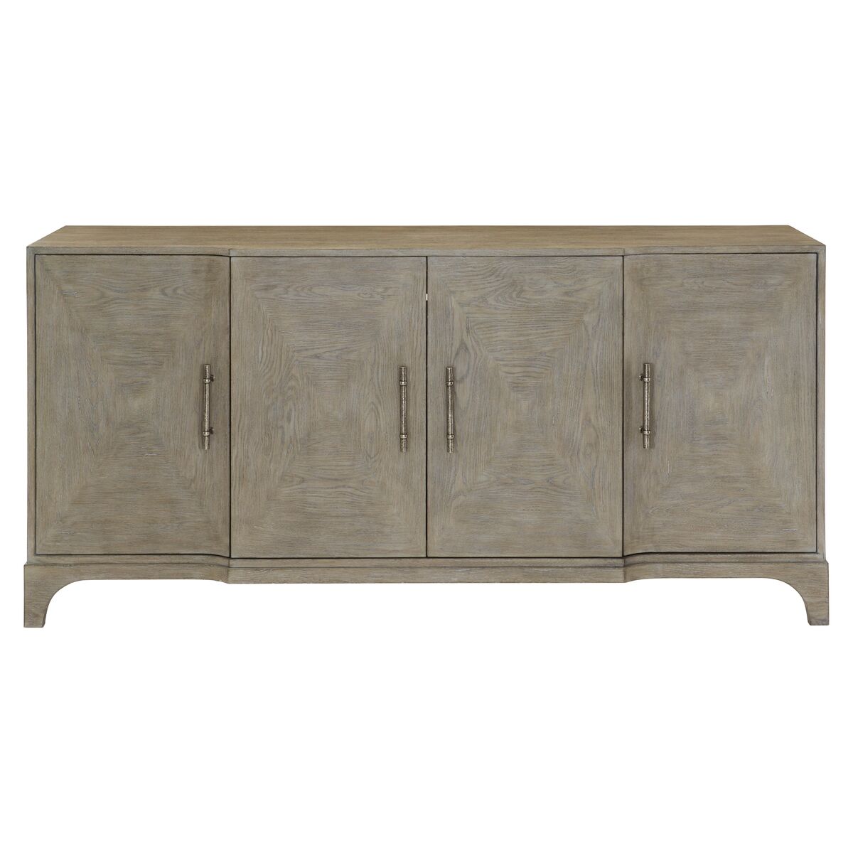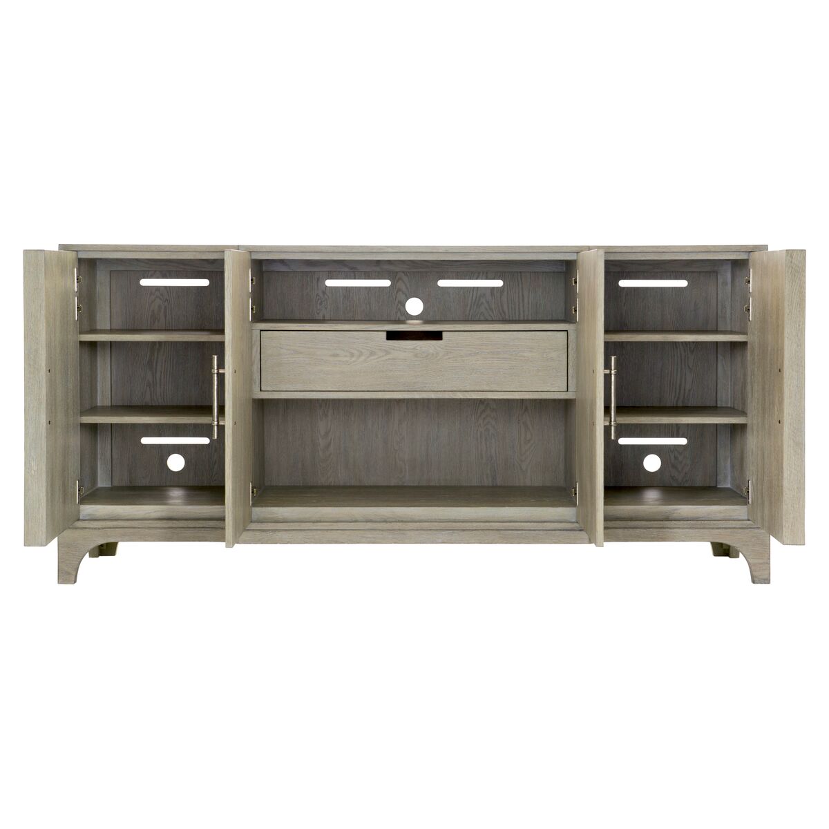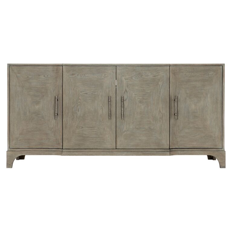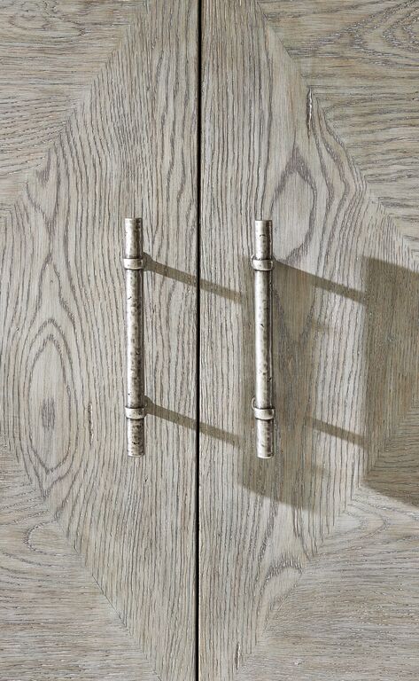 White Oak Solids And Knotty White Oak Veneers Breakfront Buffet In Pewter Finish With Four Fancy Face Doors With Soft-Close Concealed Hinges. Behind End Doors Are Two Adjustable/Removable Shelves, Vents And Covered Grommet Hole In Back Panel. Behind Paired Center Doors Are One Soft-Close Drawer With Hand-Pull Cutout And Brown Guardian Cloth Silverware Insert, And A Compartment Above And Below With Vents And Grommet Holes. Adjustable Glides.