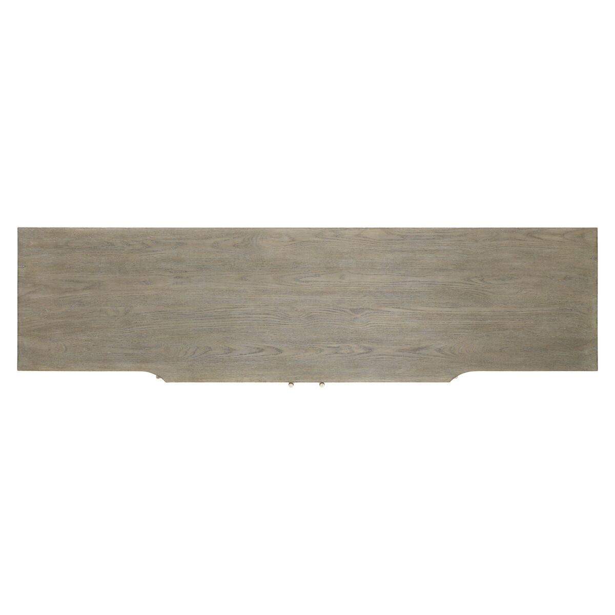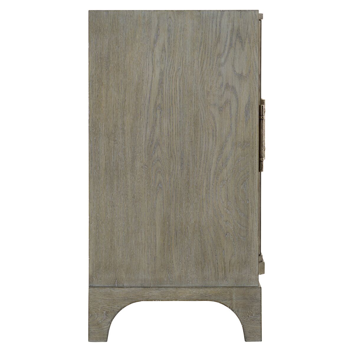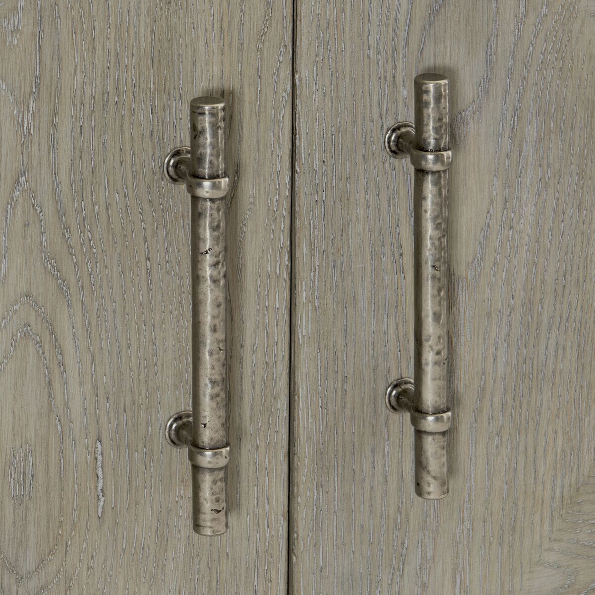 White Oak Solids And Knotty White Oak Veneers Breakfront Buffet In Pewter Finish With Four Fancy Face Doors With Soft-Close Concealed Hinges. Behind End Doors Are Two Adjustable/Removable Shelves, Vents And Covered Grommet Hole In Back Panel. Behind Paired Center Doors Are One Soft-Close Drawer With Hand-Pull Cutout And Brown Guardian Cloth Silverware Insert, And A Compartment Above And Below With Vents And Grommet Holes. Adjustable Glides.