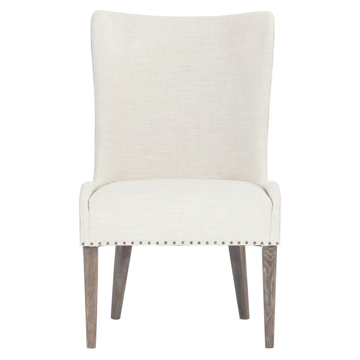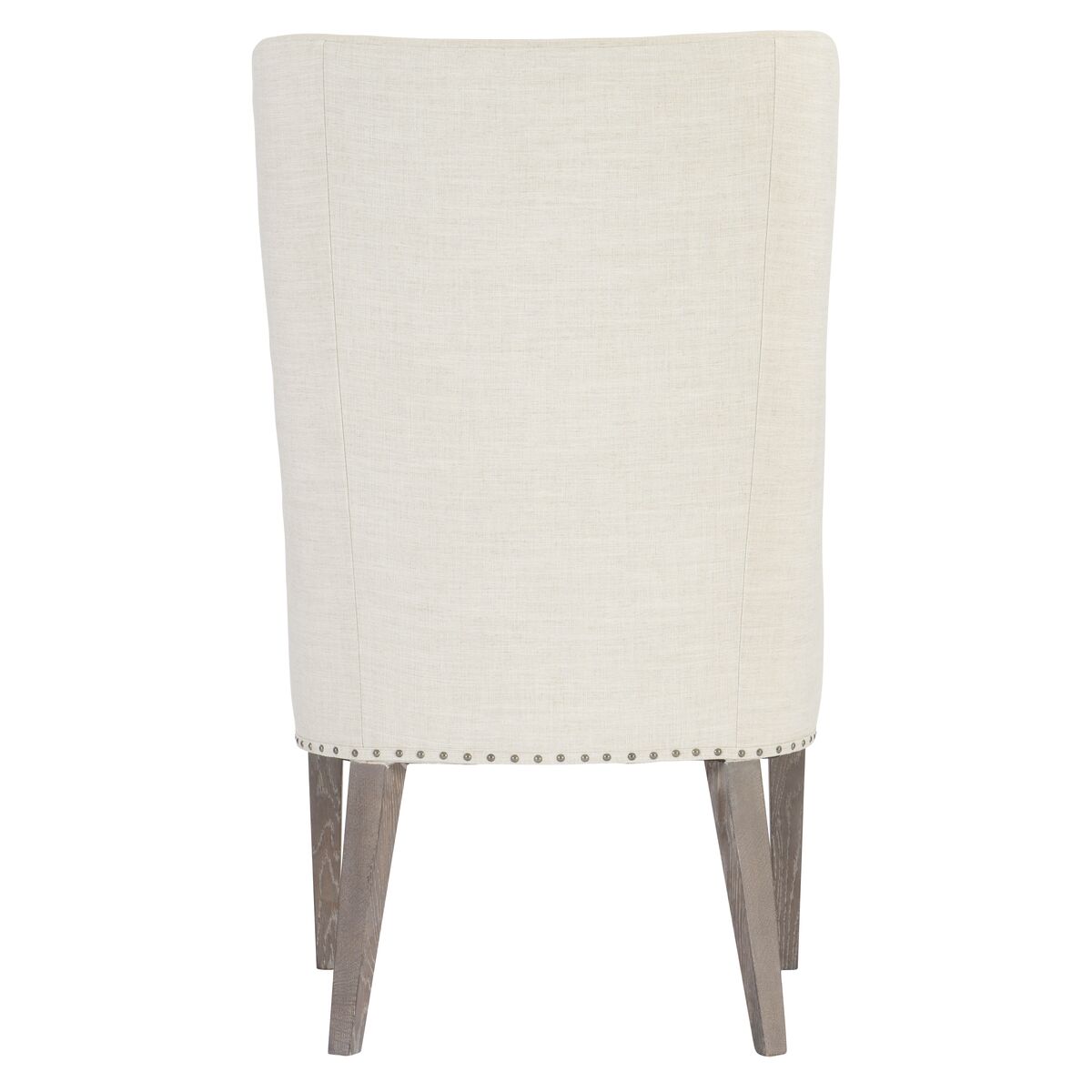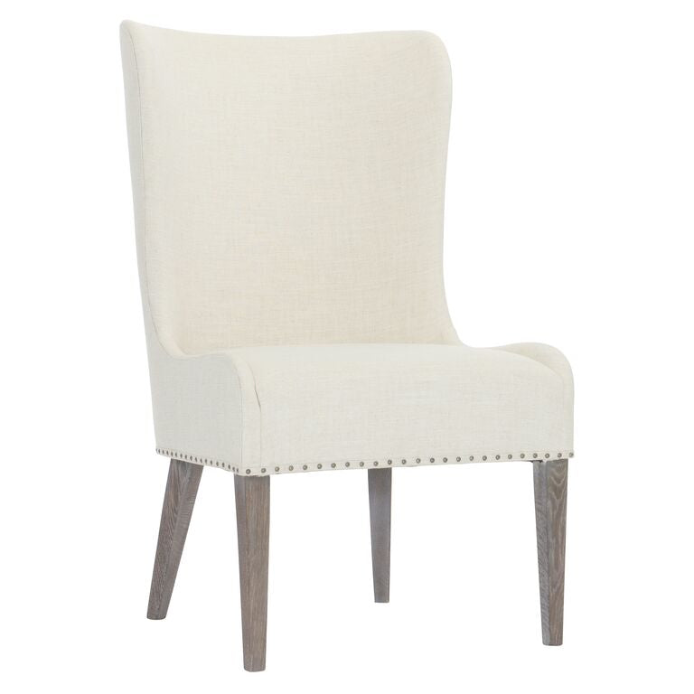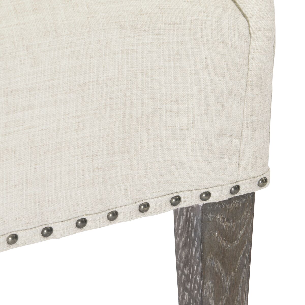 Upholstered With Pewter Finish On Exposed Wood Legs. Nail Trim #44 Antique Nickel Around Bottom Of Chair. Fabric B586.
