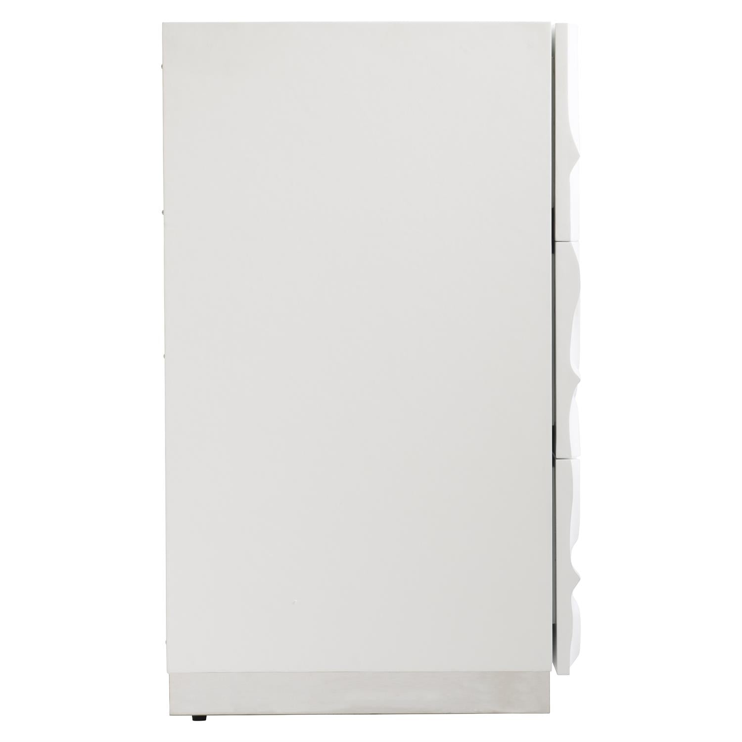 Dresser In White Plaster Finish On Case And Six Push-To-Open Soft Close Drawers With Carved Cast Resin Fronts. Polished Stainless Steel Recessed Plinth Base. Center Support Leg. Adjustable Glides.
