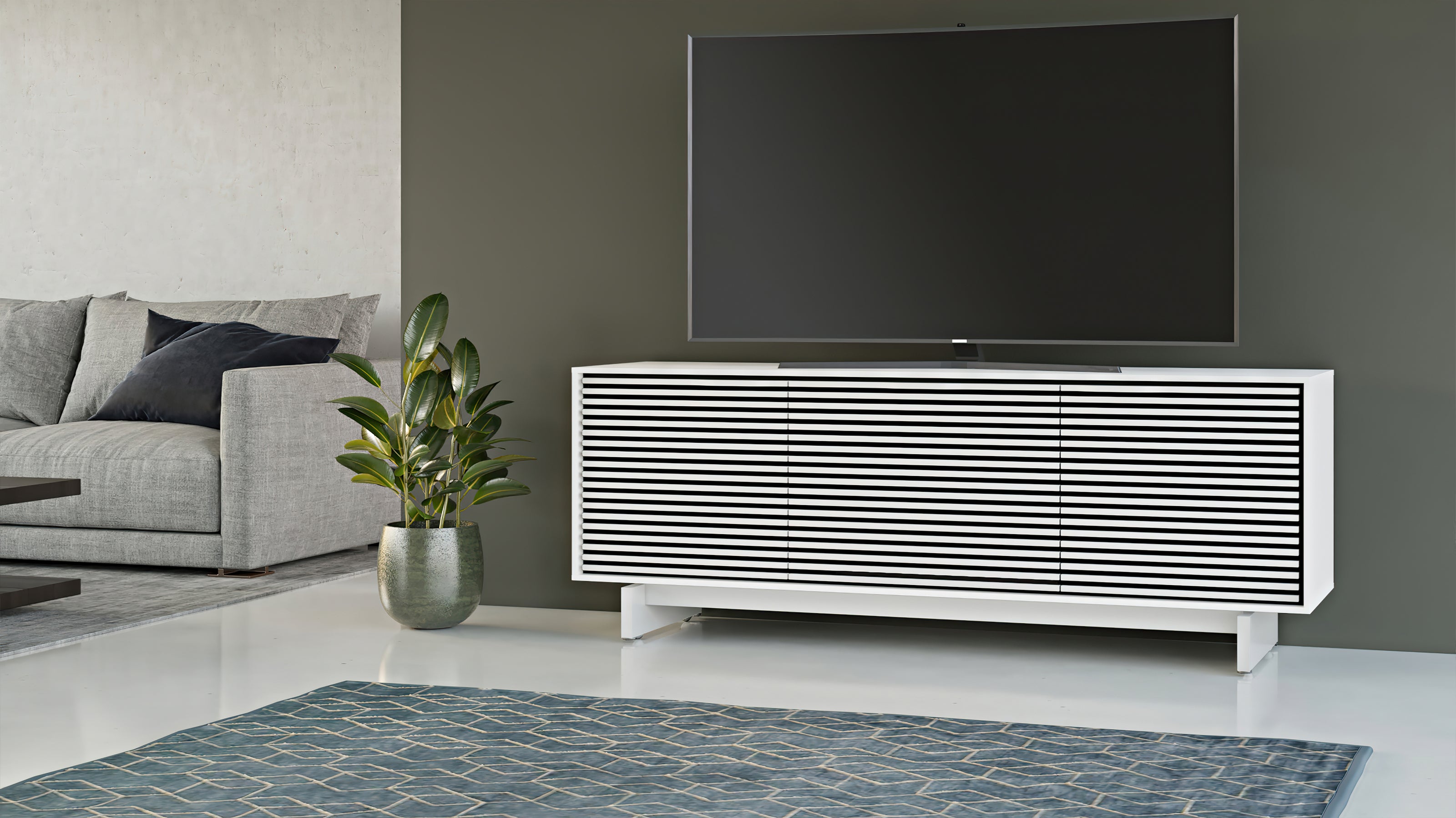 A modern console with a unique center drawer, a full-width soundbar shelf, and ample storage for movies, video games, and other media. Select from a Media base with wheels or taller Console base.