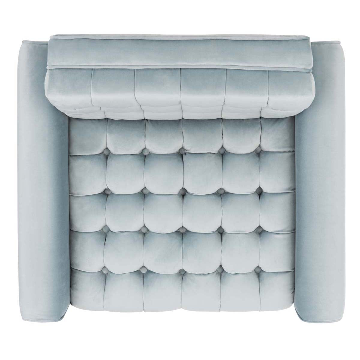 Update your living room with this Amaris Accent Chair, a contemporary spin on a retro classic. Inspired by Mid Century design, Amaris features generously filled slate blue velvet upholstery that's perfectly embellished with rich button tufting. Vintage style black legs and sleek brass caps complete the look.