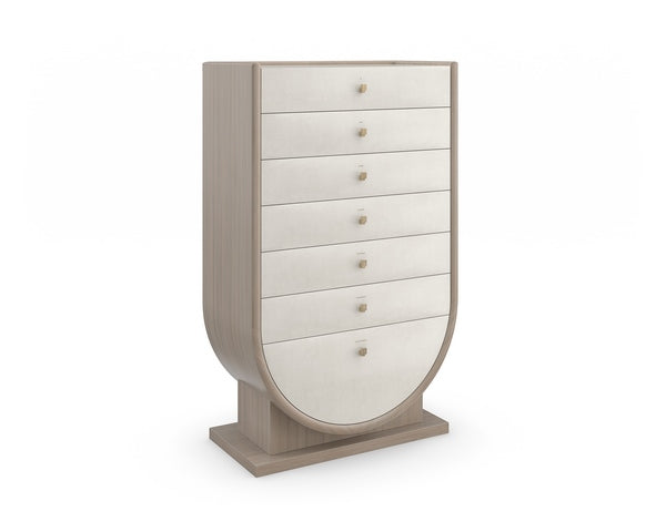 Drawing the eye with its striking shape and height, this semainier chest lets you create a one-of-a-kind, sensory experience. With a graceful form inspired by Grecian pottery, it features seven drawers, one for each day of the week, notated by corresponding brass brads and tactile hardware that can be seen and felt, even in low light. Perfect for keeping lingerie and linens, its Ivory Craze finish adds to its alluring texture and elegant presence.
