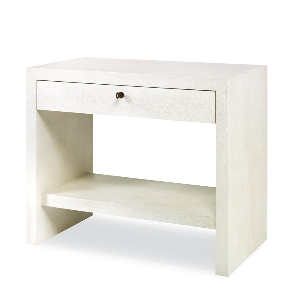 Dove white finish faux shagreen. Single drawer with antique brass finish fixed key hardware above open shelf