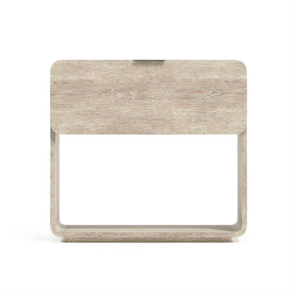 The Antibes nightstand has a an open bottom shelf that adds a lightness to its modern organic design. Topped with a single drawer with a shaped front, it is finished in the warm and natural Roz. A two-port A+C USB charging station is available for tech tools.