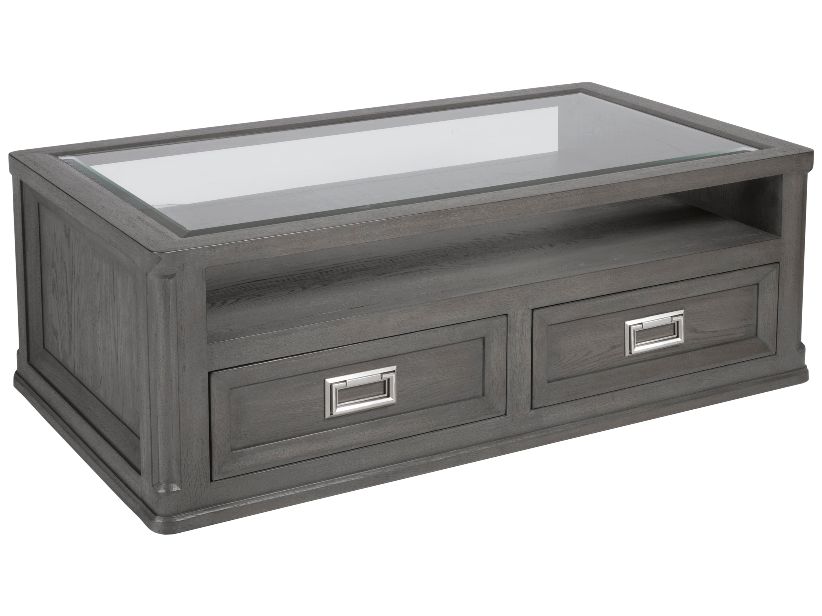 Double the function with an open display compartment under an inset glass top. The two drawers with brushed nickel hardware provide hidden storage making this an ideal cocktail table, in a medium gray wire-brushed finish.