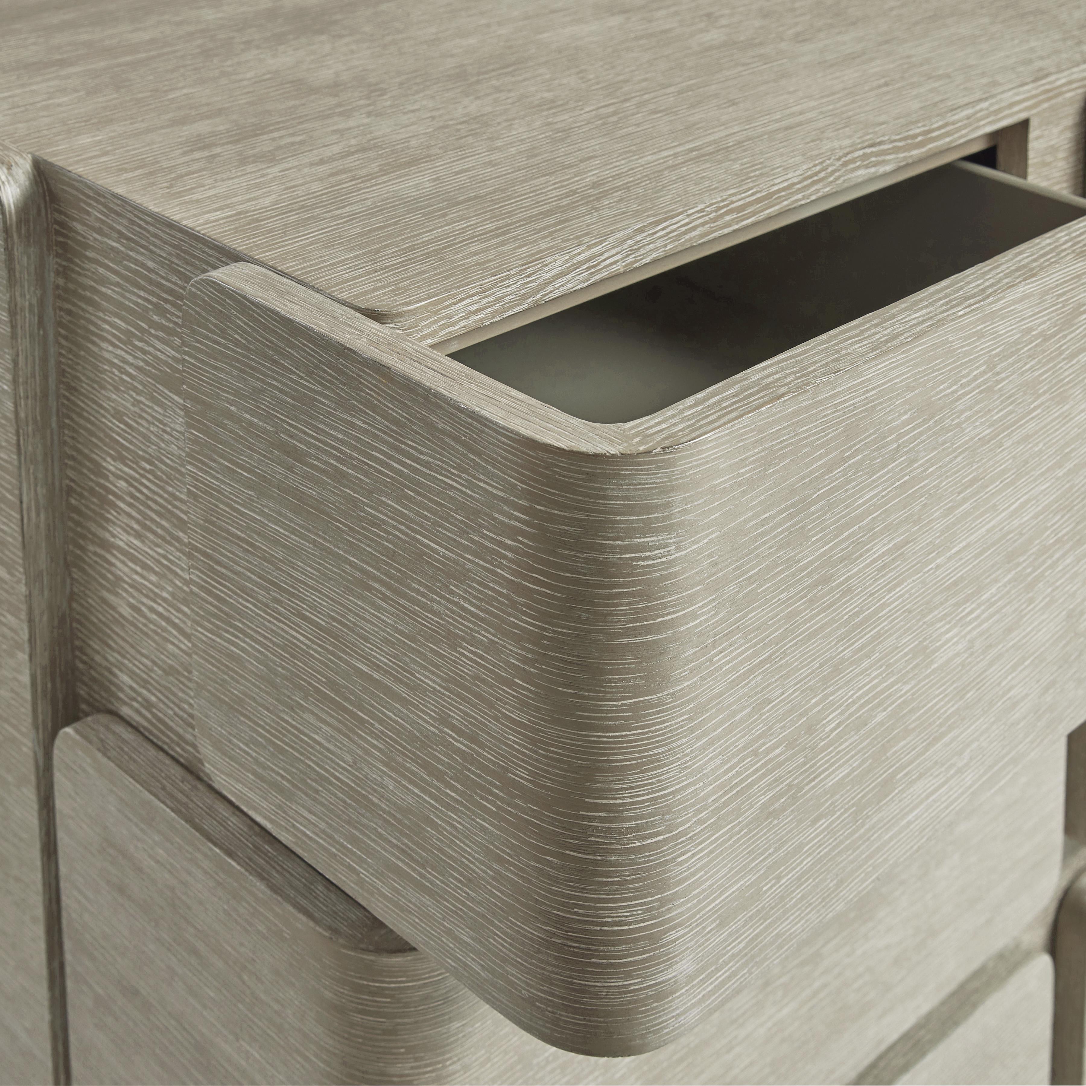 The Arcadia dresser offers an understated design that is both modern and unexpected. The six outside drawers wrap around the sides of the dresser, offering a unique detail. Three larger center drawers have flat fronts. The wire-brushed dresser is finished in Clay for a beautiful textural style.