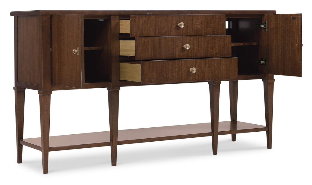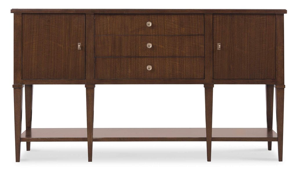 Make a sophisticated statement with the Archives Server, combining refined materials like figured walnut veneers, and a striking Castle Grey marble top. The high clarity Classic Walnut finish enhances the server’s depth and richness, while satin brass hardware adds a luxurious touch. Featuring two doors, three drawers, and an adjustable shelf, this server offers ample storage space, including a silverware tray. Perfect for the dining room, this piece offers both practical function and timeless design, ideal for those who appreciate structured elegance.