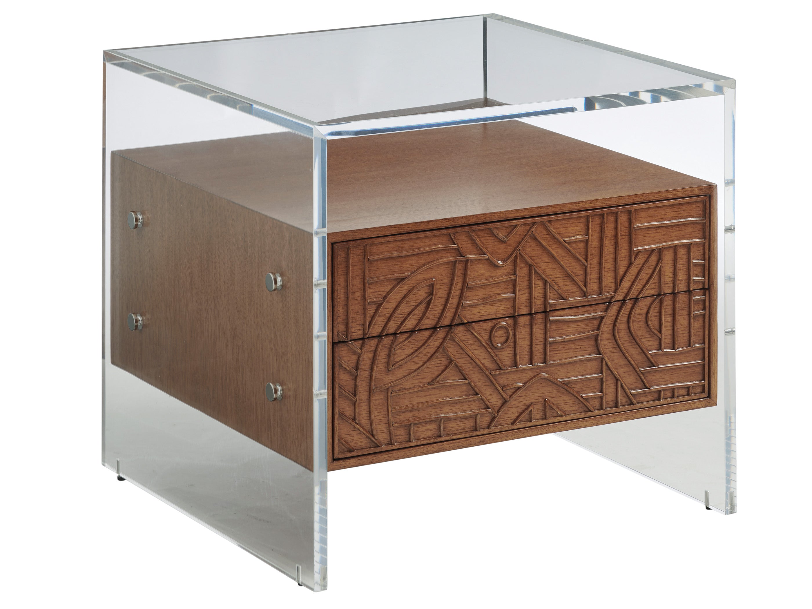 Dimensions: Width: 26.25 Depth: 26 Height: 24. 25 Weight: 146 - Acrylic frame with suspended drawer box. 2 touch-to-open drawers featuring decorative hand-applied pencil rattan.