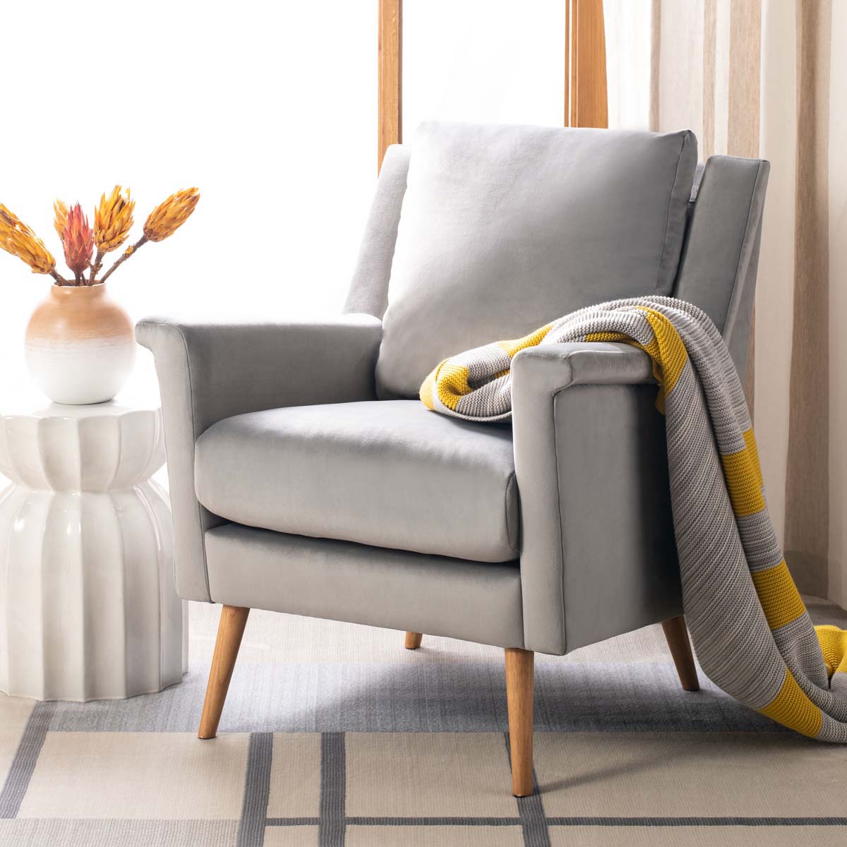 Fashion forward and endlessly chic, this Astrid Mid Century Armchair elevates any room with its contemporary spin on a retro classic. Astrid is welcoming and luxurious in soft stone velvet, and splayed solid oak legs perfectly balance the look.
