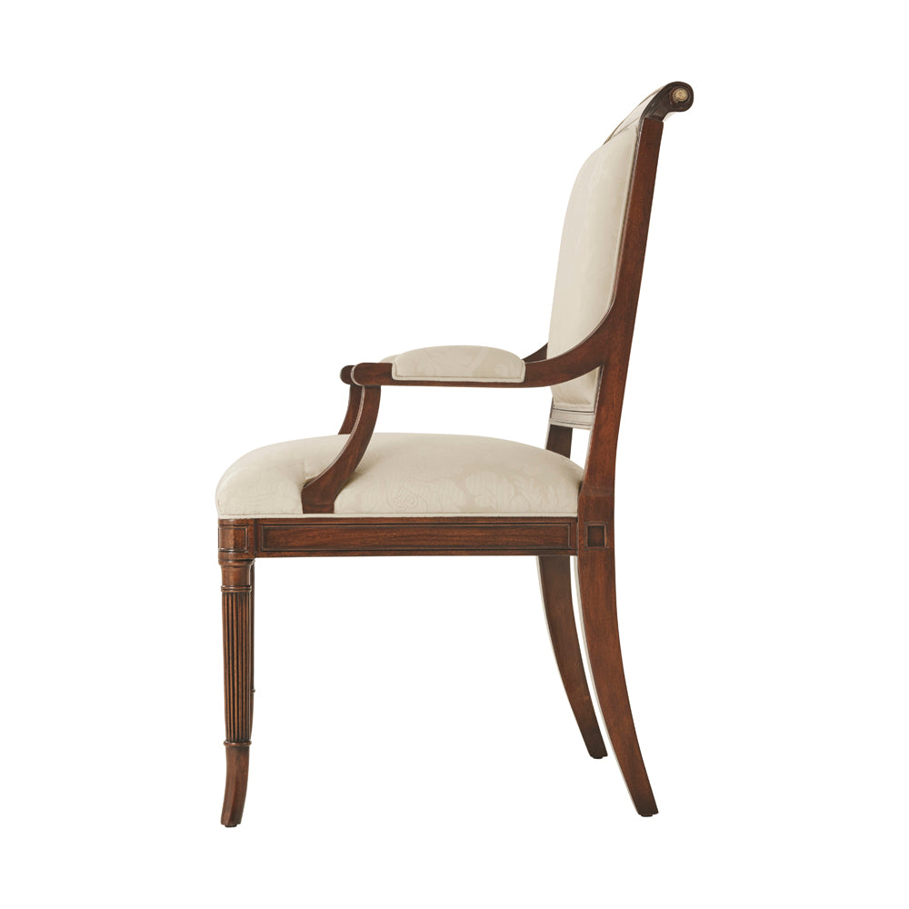 A finely carved mahogany dining armchair, the upholstered framed back with a swirl mahogany veneered scroll over toprail with fine brass details, the upholstered seat between part padded arms, on panelled seat rails with turned and fluted legs with splay feet.